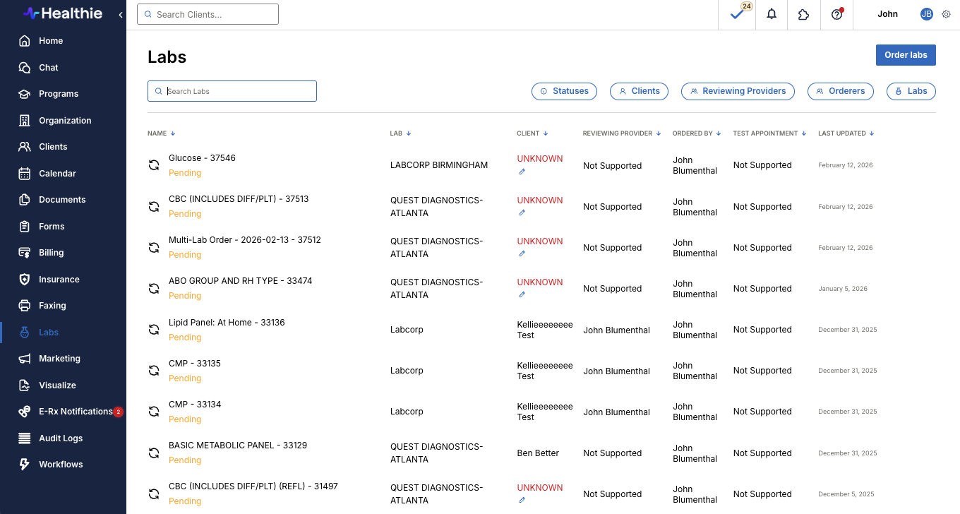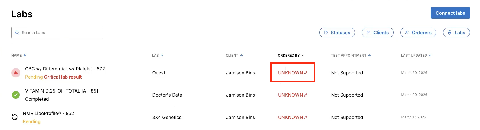 If a lab is ordered from a shared organization Fullscript account, the lab result will return to the client's provider in Healthie and the provider will be notified that new lab results are available to view. Within the Labs tab, the "Ordered By" column will display as "UNKNOWN".