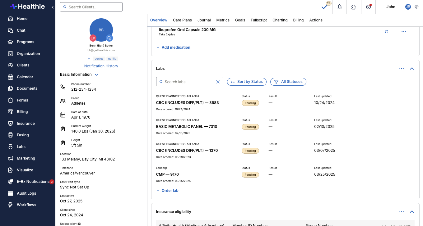 Fullscript integrates with Healthie to make it easy for providers to order labs and specialty tests for clients, and automatically syncs lab results into Healthie.