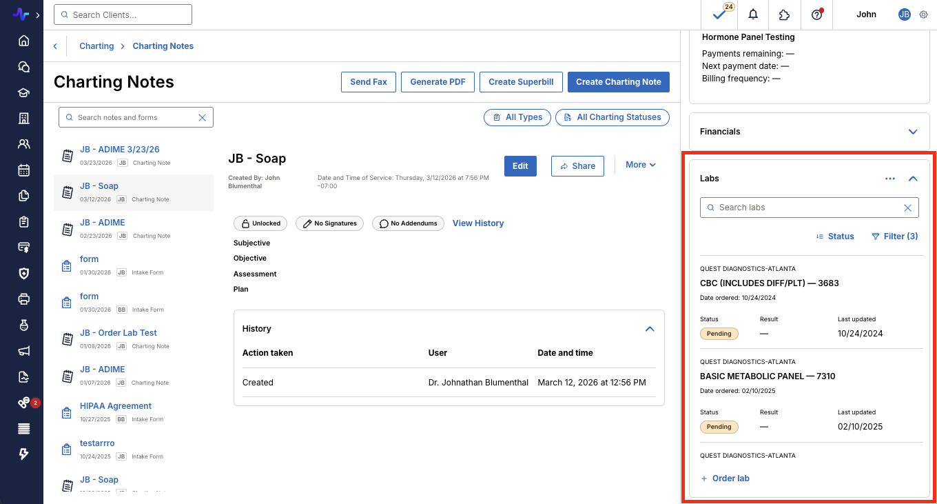 Only lab orders that have been purchased/officially ordered will show in your Labs tab to avoid confusion between “recommended” and “pending”.