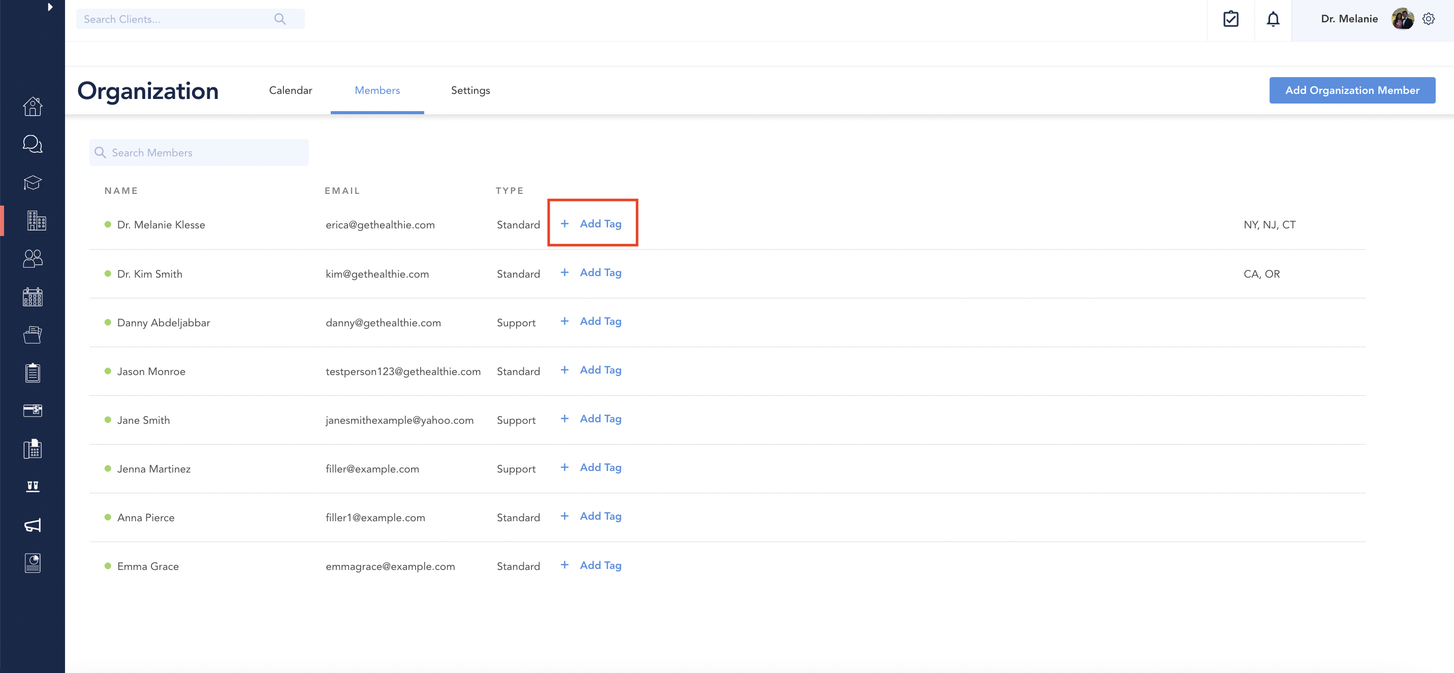 Additionally, account admins and support staff can also use tags to keep track of important team member administrative information, such as credentialing status, updated licensure, and insurance payers they are in-network with.