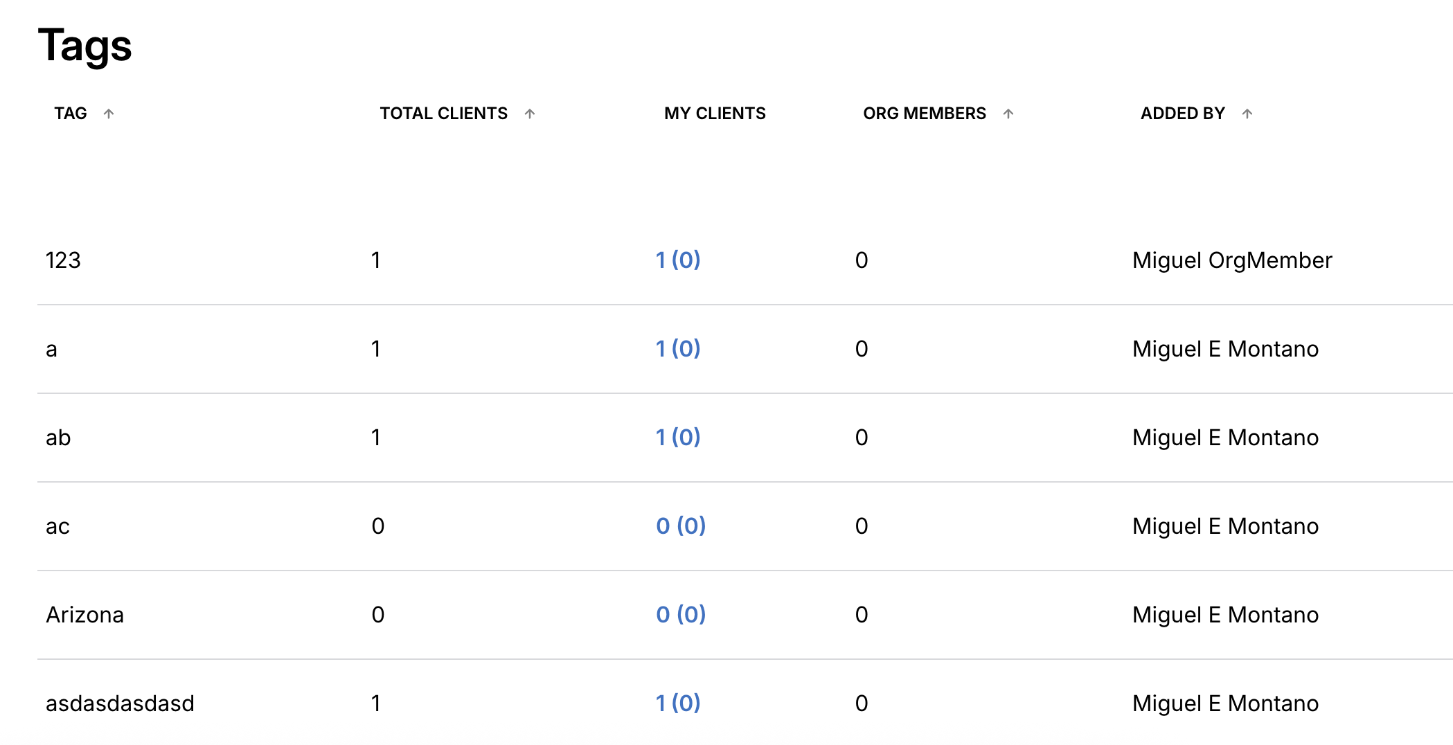 Both Client Tags and Team Member Tags can be managed from the Tags Manager page. All collective tags can be viewed, renamed, or deleted from this centralized location.