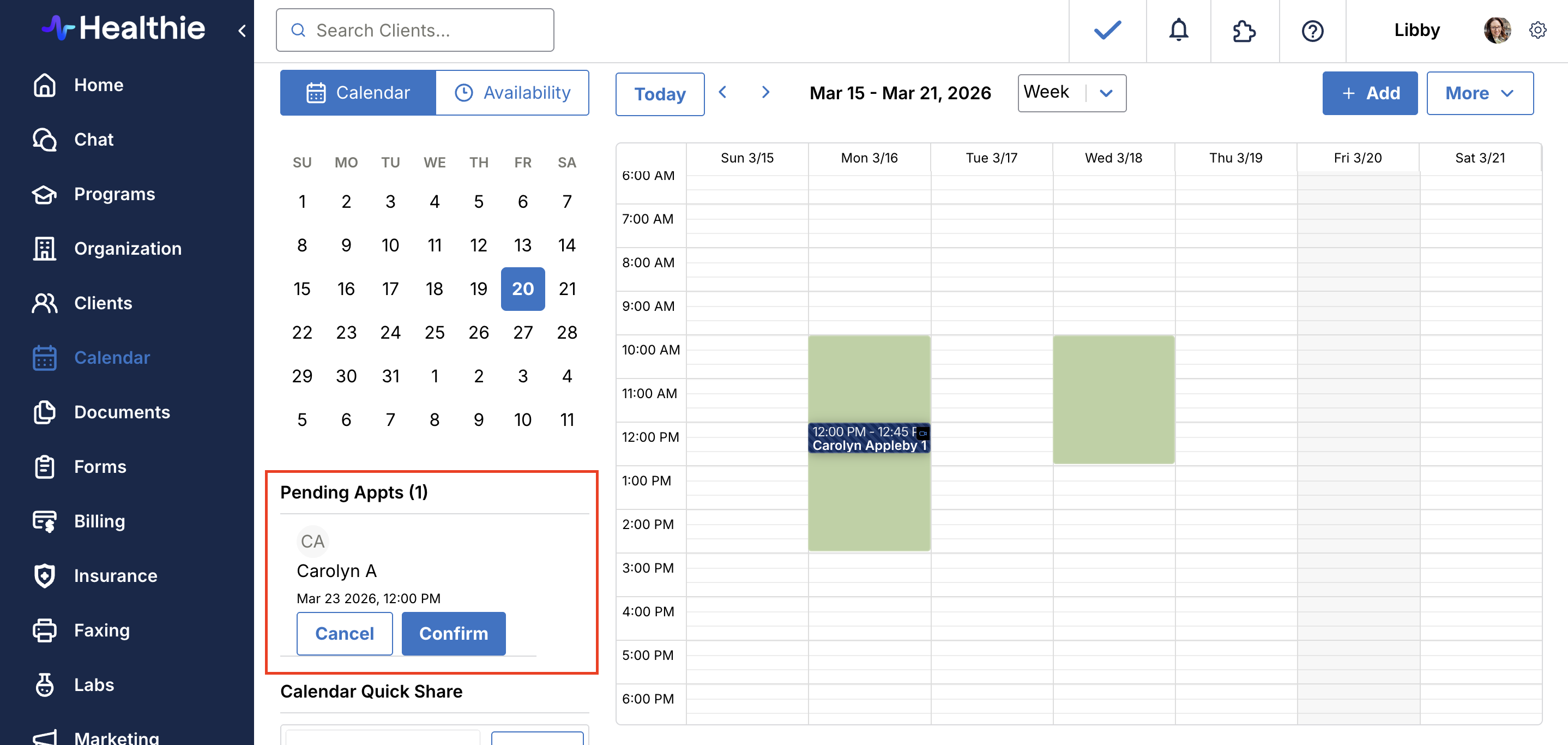 Click Calendar, and on the left-hand side panel, you'll see Pending Appointments - review this list and click "Cancel" or "Confirm