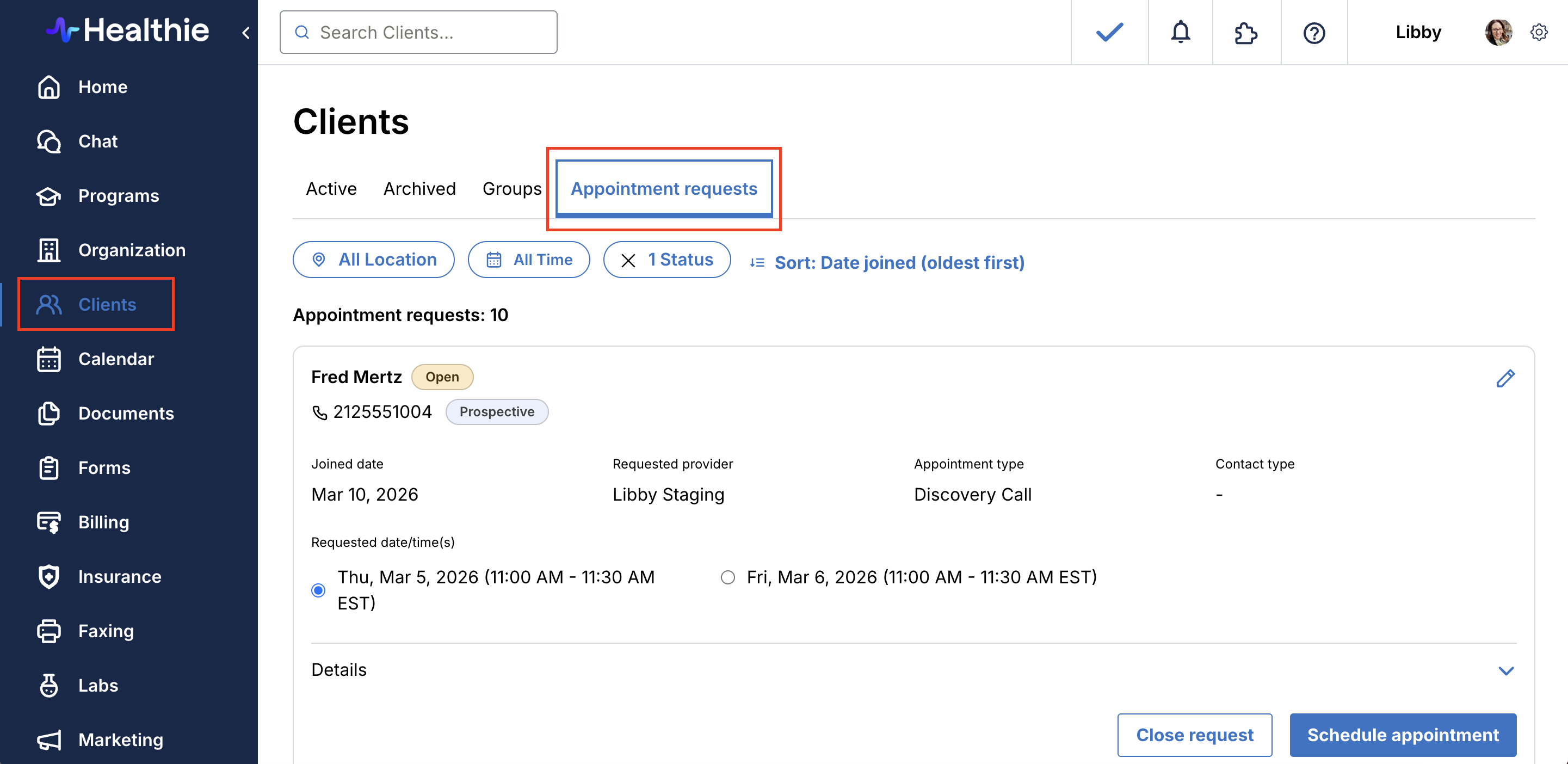 Within Client page you can view appointment requests by selecting the Appointment Requests tab at the top of the page. , To confirm an appointment here, click the Schedule Appointment button.
