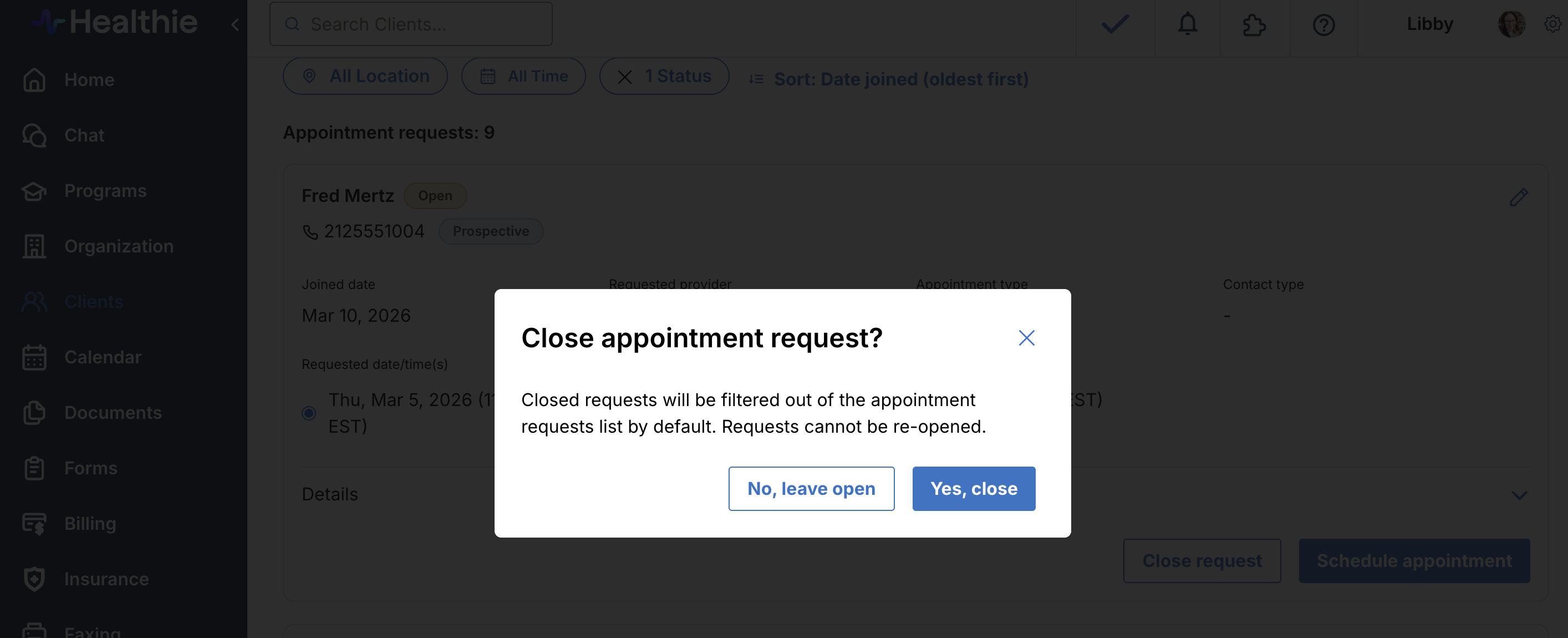 If a client has selected multiple days or times for options, you can select which you want to schedule. If you do not wish to schedule this client, you can Close Request.