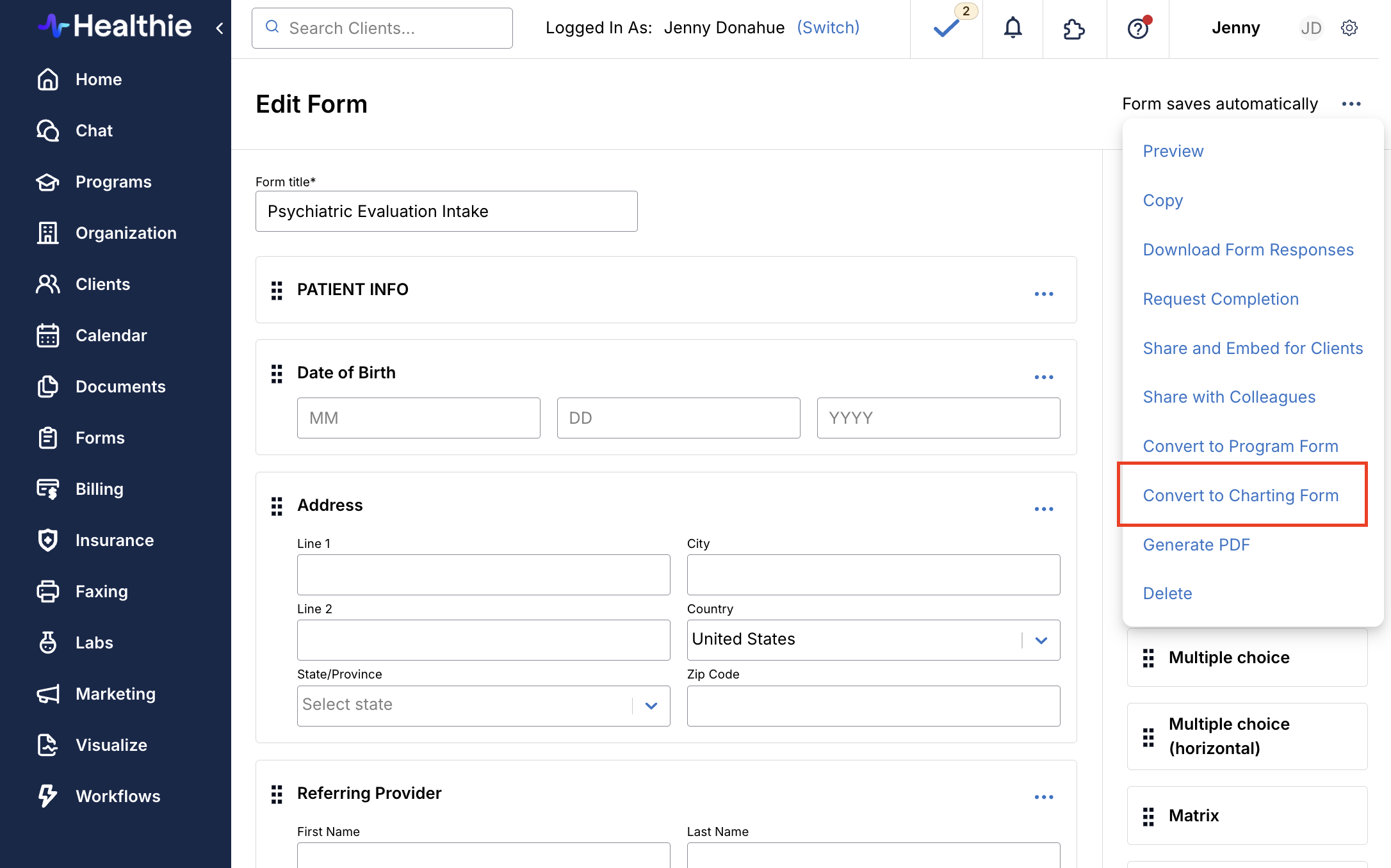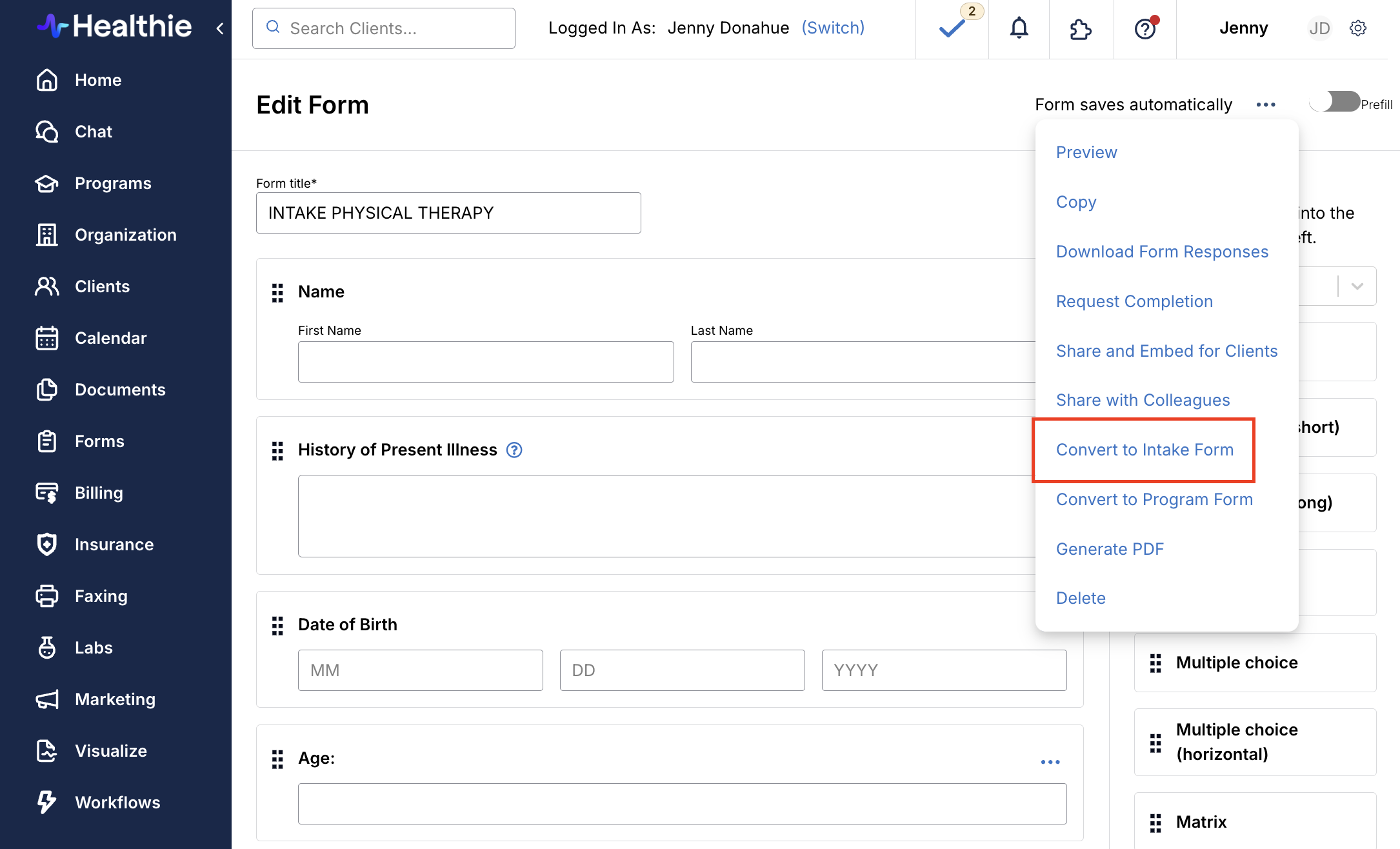 Note: Intake forms can also be converted back into charting templates.