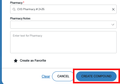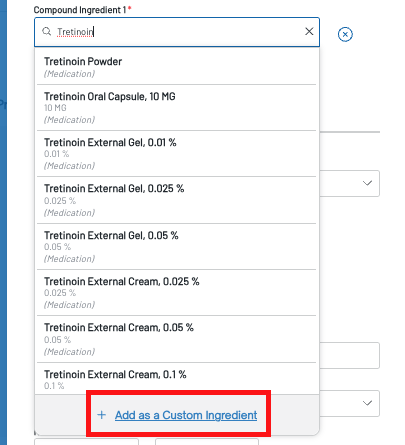 - If the desired strength or ingredient is not present in the search results, click Add as a Custom Compound to create a custom ingredient