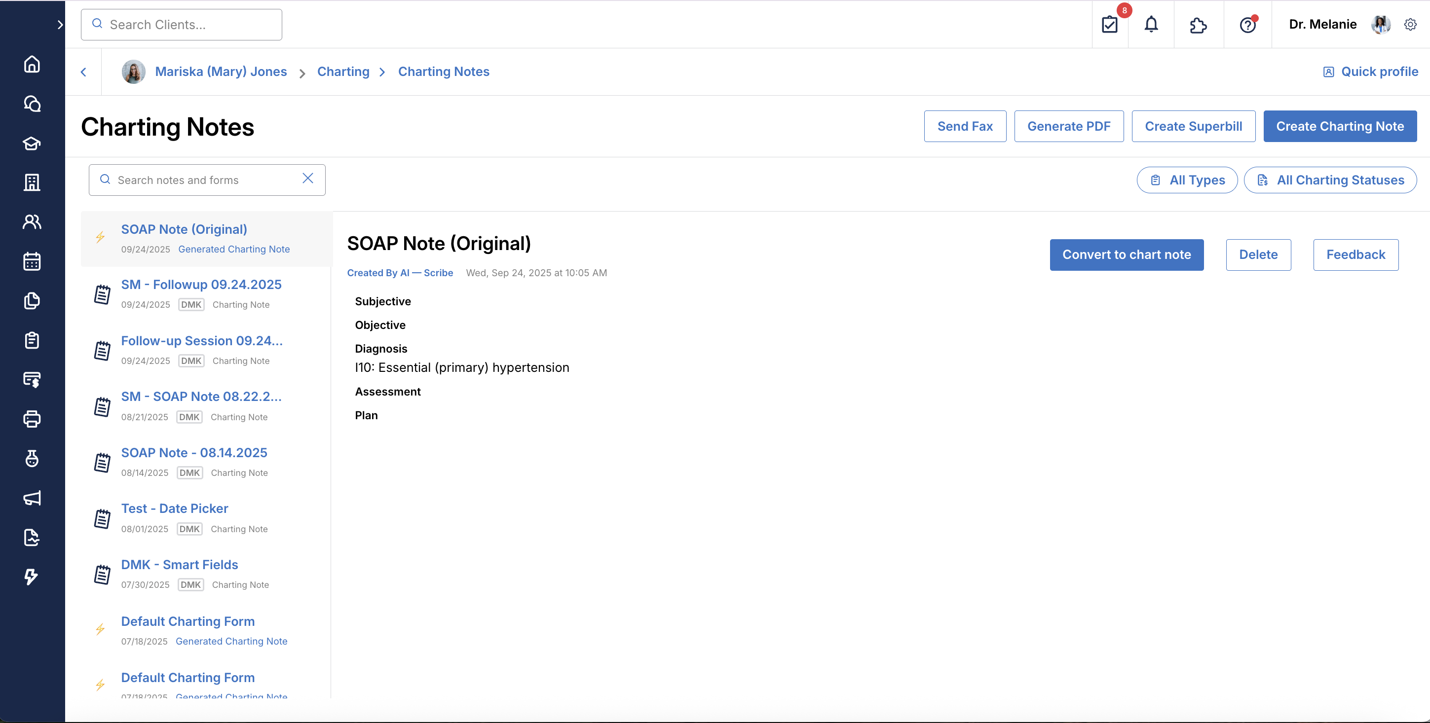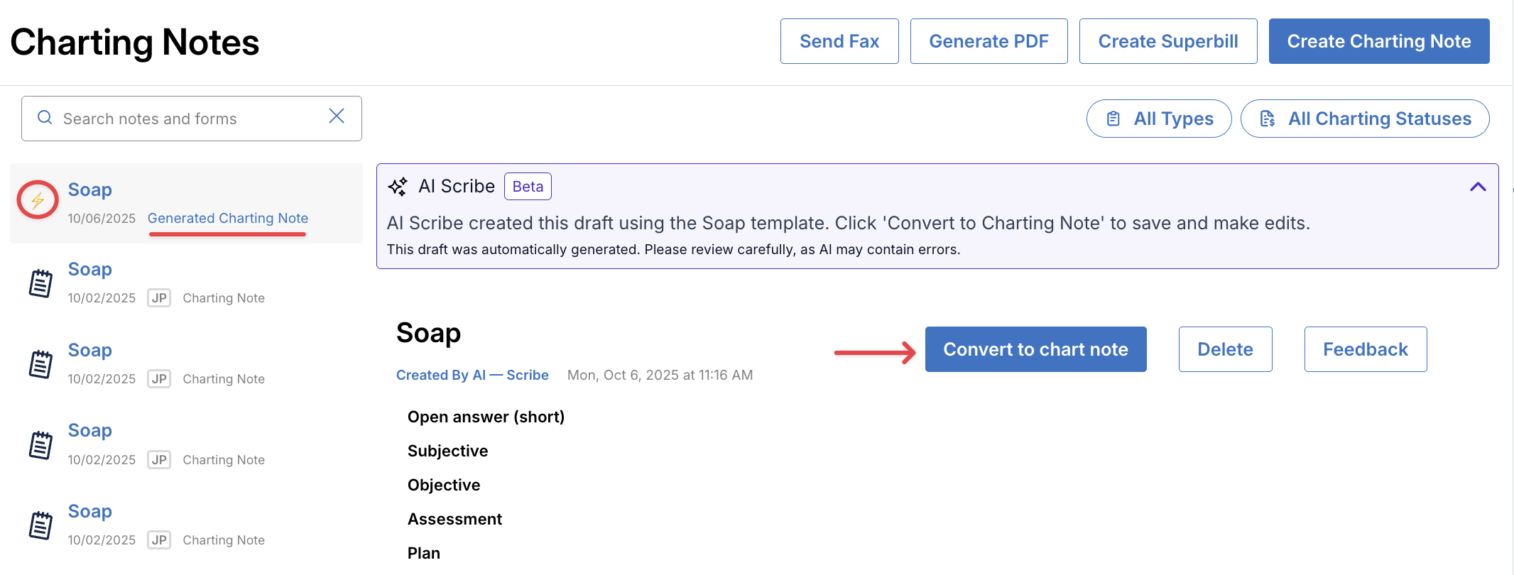From here, you can click "Convert to chart note" to edit or take further actions on the AI-generated charting note (such as sign or lock your note). When converted to a charting note, this specific note will also be linked in the appointment session details.
