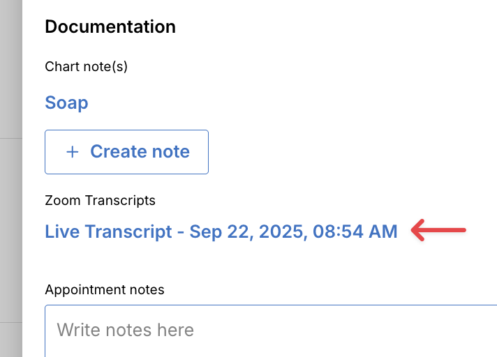 Transcripts are available in the session details side panel. Only providers who have access to these appointments can see the transcripts. They'll download as .vtt files and will open in any text editor. We retain transcripts indefinitely and they cannot be deleted.