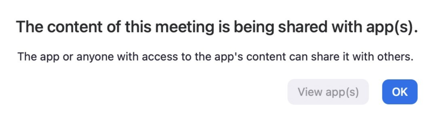 When clients join a Zoom session, they will see a single notification that says: "The content of this meeting is being shared with app(s)." Clicking the OK button dismisses the notification.