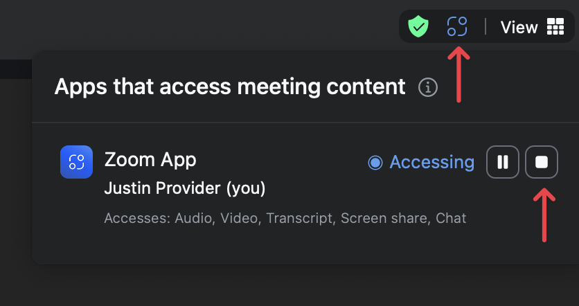 During your conversation with a client, Scribe generates a transcript behind the scenes and uses the transcript to create a charting note. To stop transcriptions and disable Scribe, click the Apps icon then the Stop icon. Only the provider can stop transcriptions.