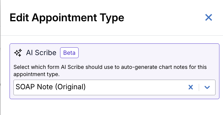 You can use any of your custom or specialty chart note templates. Whether you use SOAP notes, ADIME, or a fully custom template, AI Scribe will follow the structure of the template and capture relevant details. Repeat this step for each appointment type you want to enable AI Scribe for.