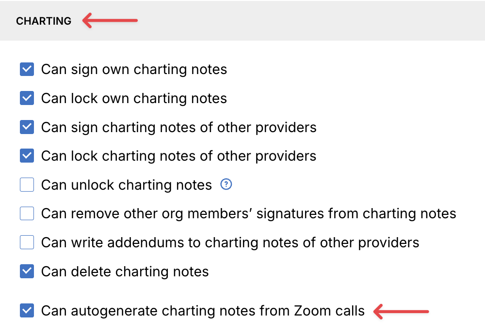 - Scroll down to the Charting section and enable the "Can autogenerate charting notes from Zoom calls" permission.