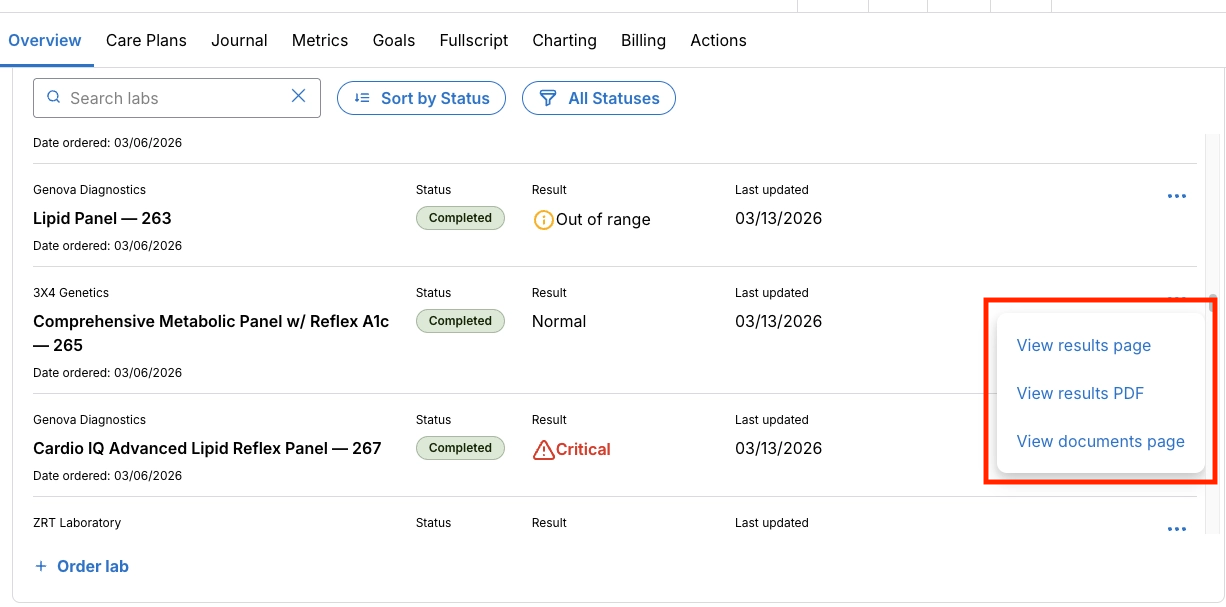 Within the Clients Profile > Overview you'll find a Labs widget. From the Client Overview, you have the option to search or filter by lab status (Completed, Pending, Error or Cancelled) or sort results by Status, Last Updated or Date Ordered.