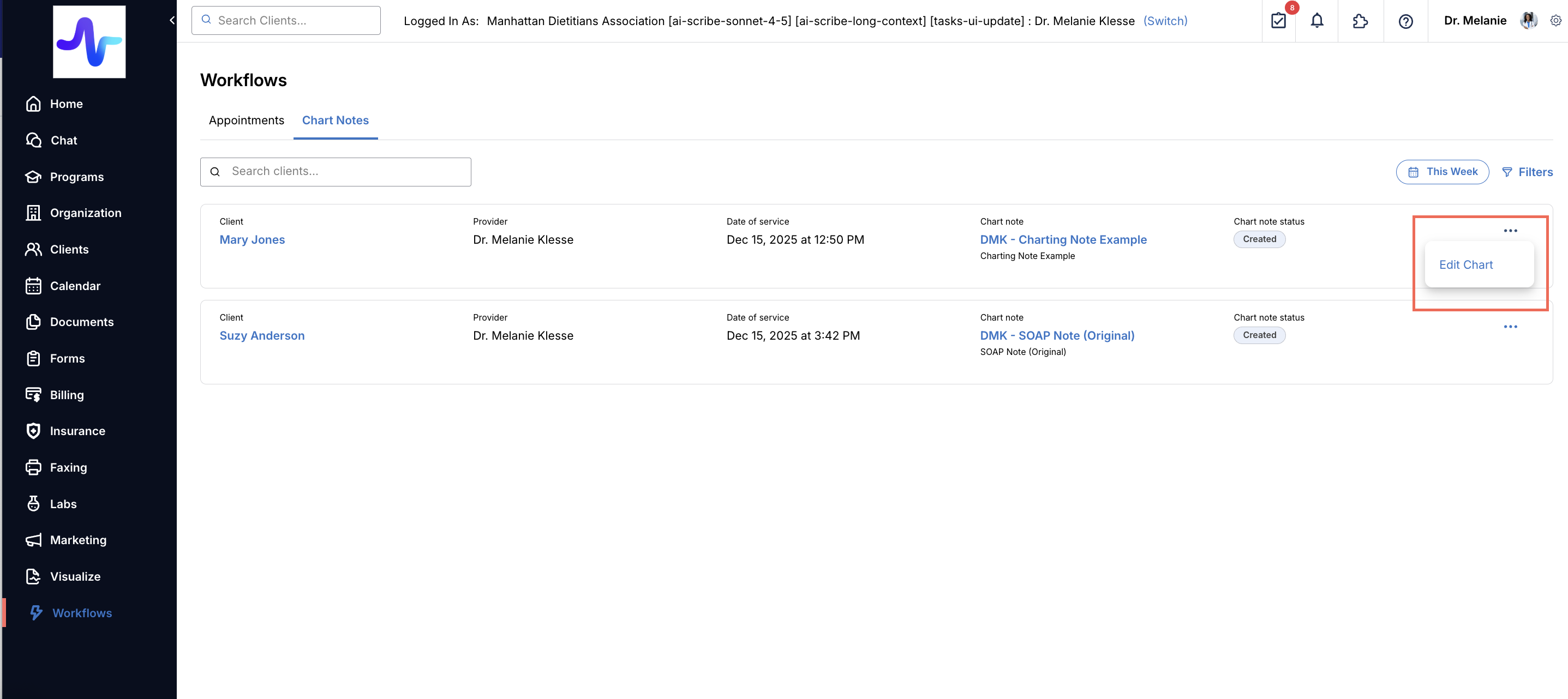Leverage the Edit Chart action directly to the Chart Notes list within Workflows. Providers can jump straight into editing draft or unsigned chart notes from the list view. This option is available for editable notes and automatically hidden once a note is locked.