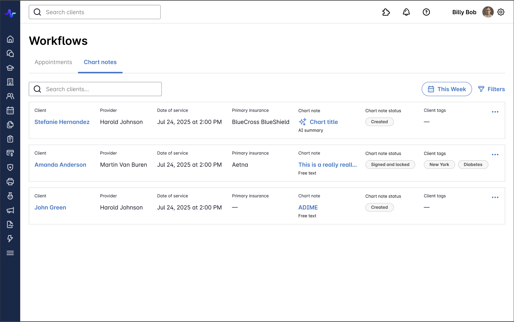 To help providers and administrators efficiently track documentation across clients and team members, Healthie has introduced a new Chart Notes tab within the Workflows section. This functionality makes it easy to identify which notes need action—such as signing or locking—streamlining your charting and billing workflows.