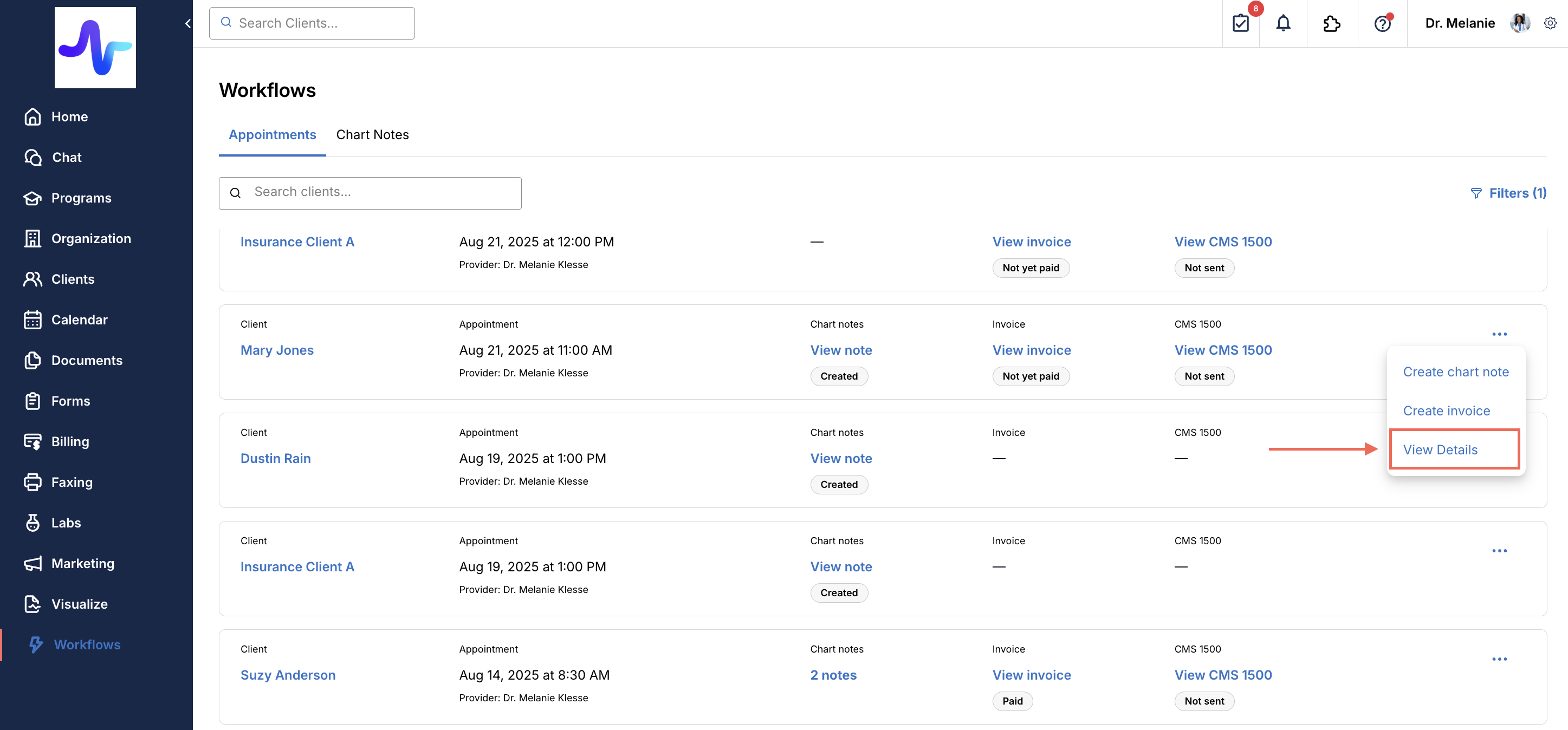 - To document sessions, create chart notes directly from the Appointment Details page for each client.