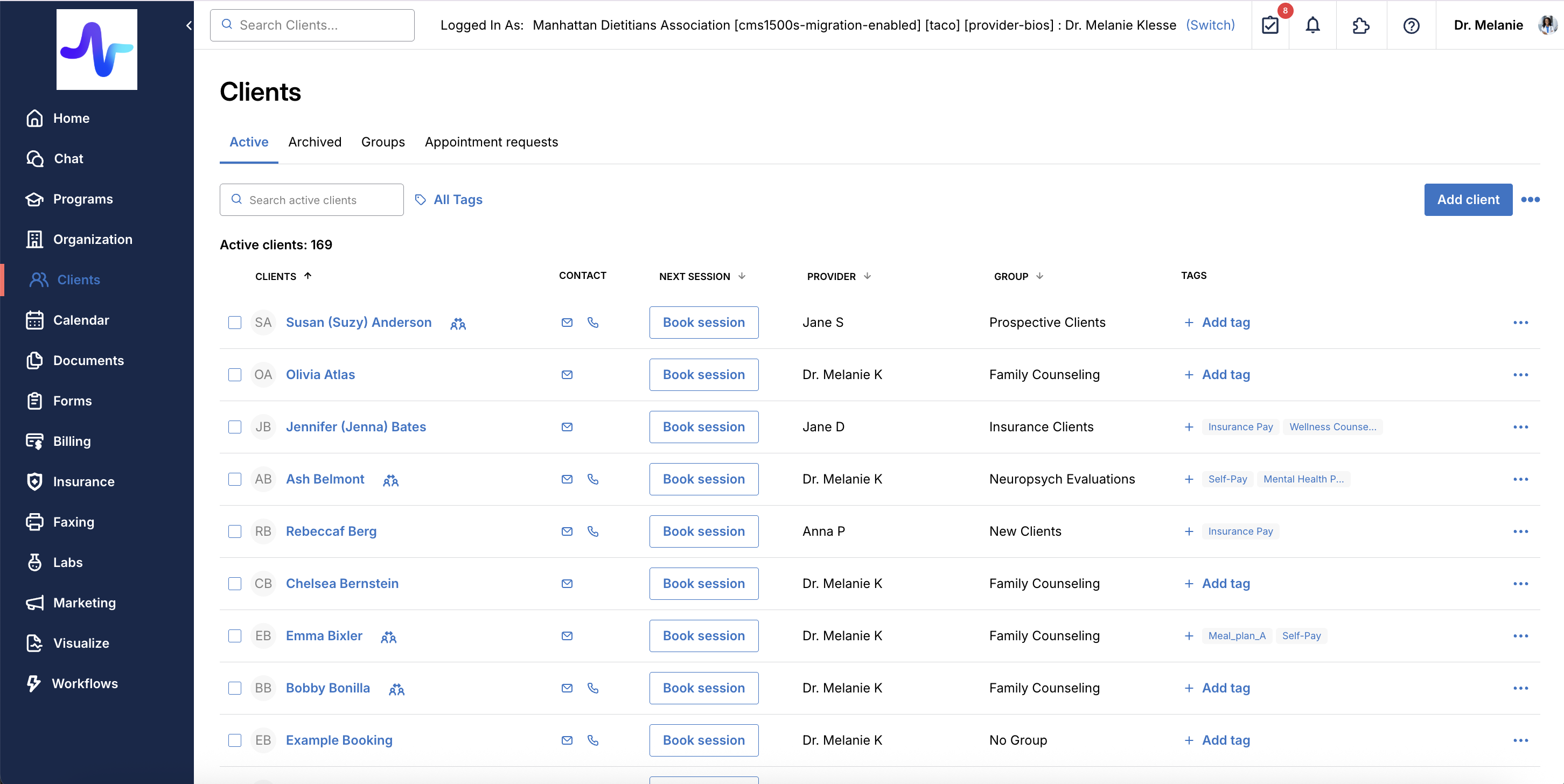 Organize clients to customize their experience with specific intake forms, documents, message blasts, and appointment types. Each client can belong to one group at a time. Learn more about client groups.