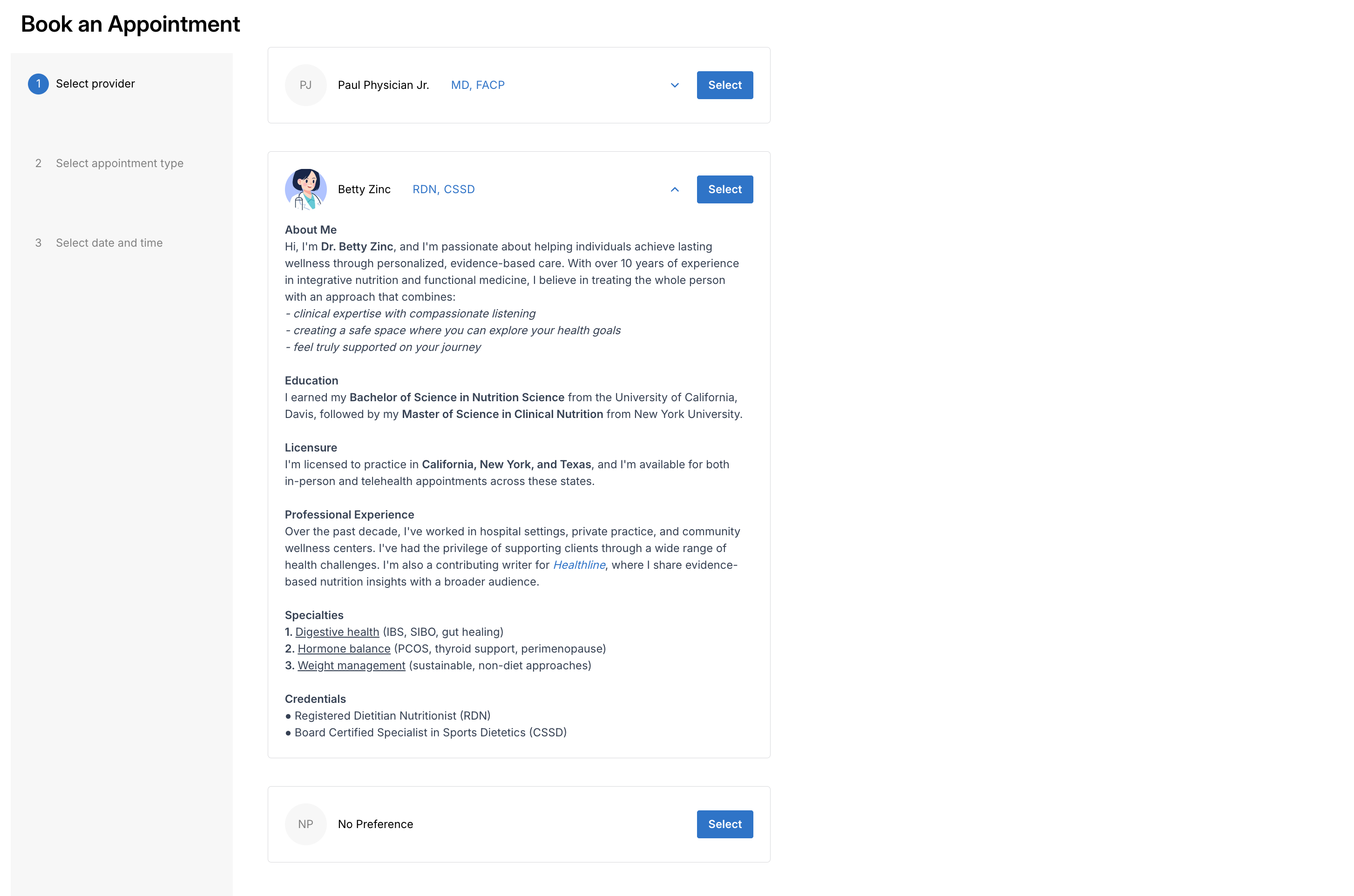 When clients book through your organization’s scheduling page, they often rely on provider bios to make an informed decision. Adding a brief professional introduction helps clients understand your background, expertise, and care approach, improving trust and conversion during booking.