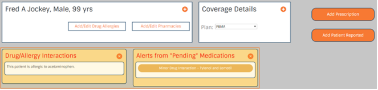 - Drug–allergy Interactions and drug–drug interactions from pending medications are displayed below the Patient Information section.