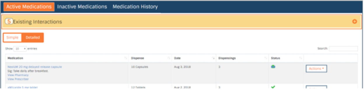 - There is also a highlighted bar across the Active Medication list, noting the number of interactions within existing/active medications. Click on the “+” icon to expand the list to show the different interactions.