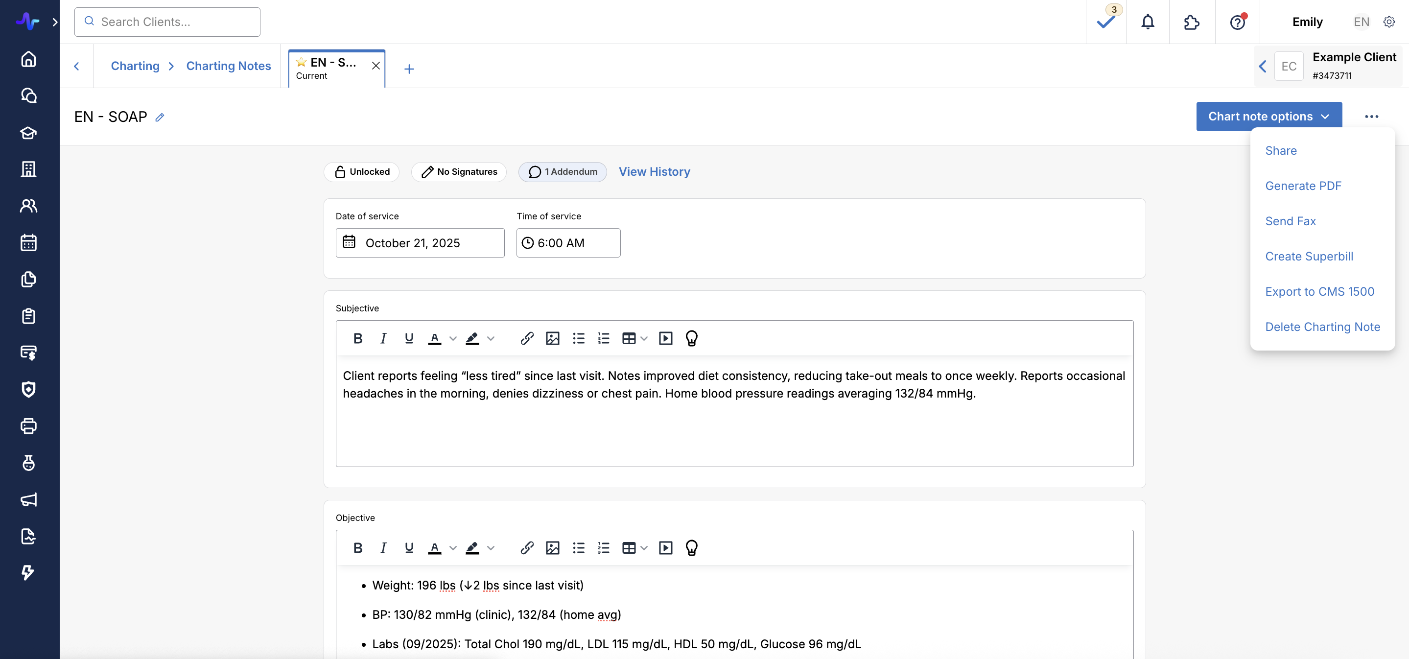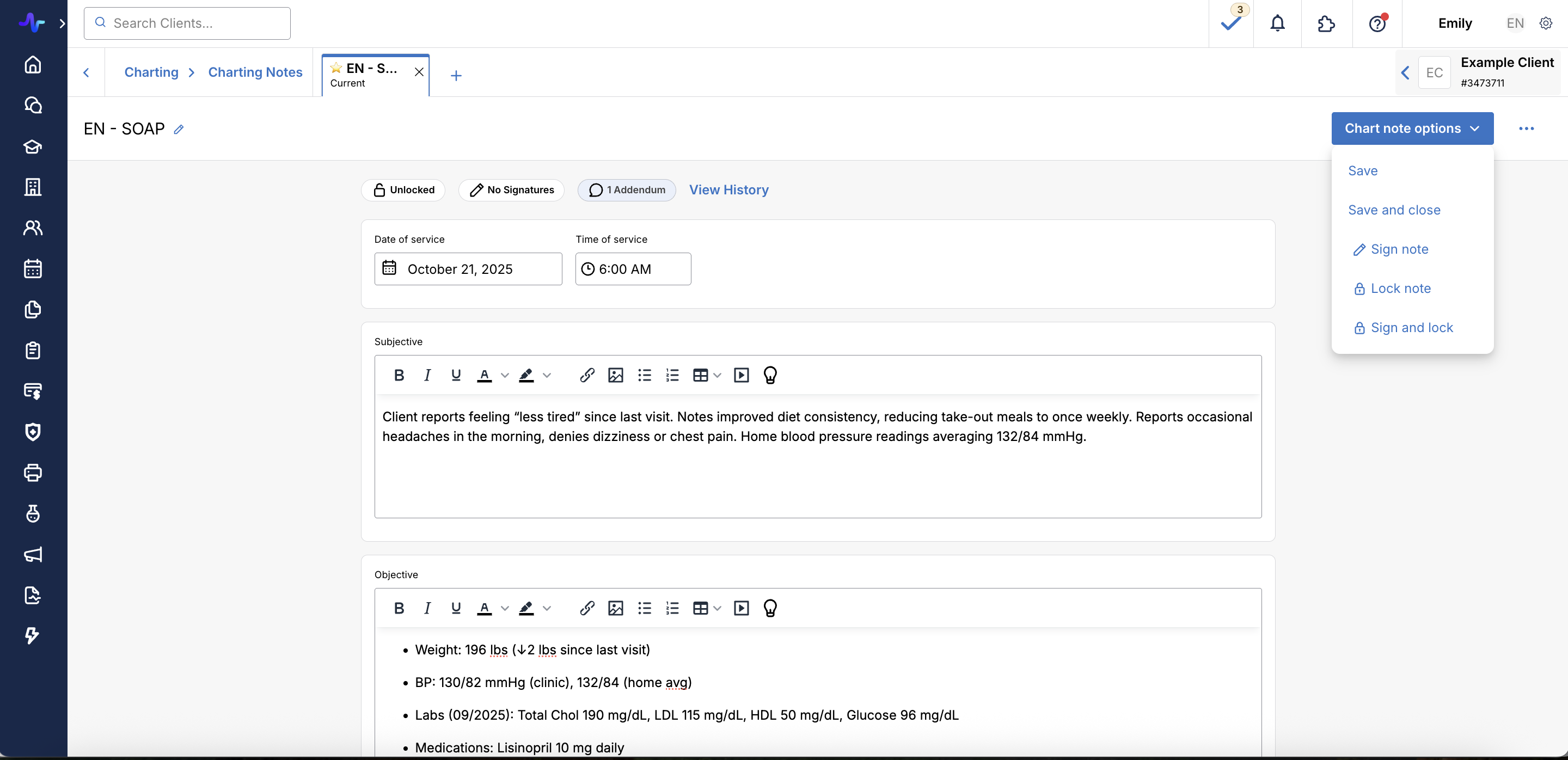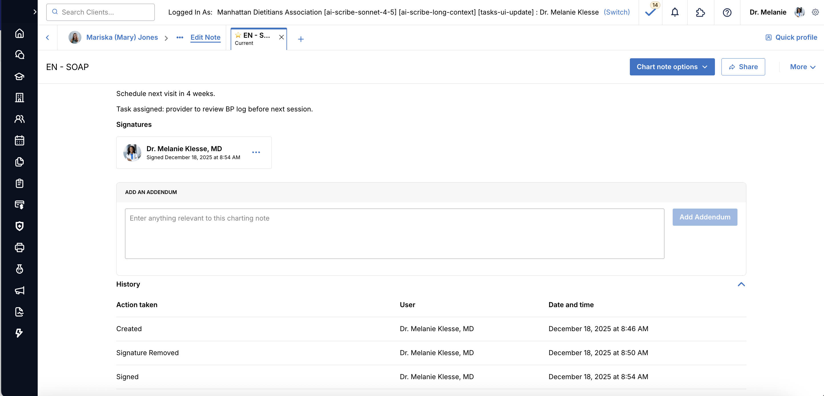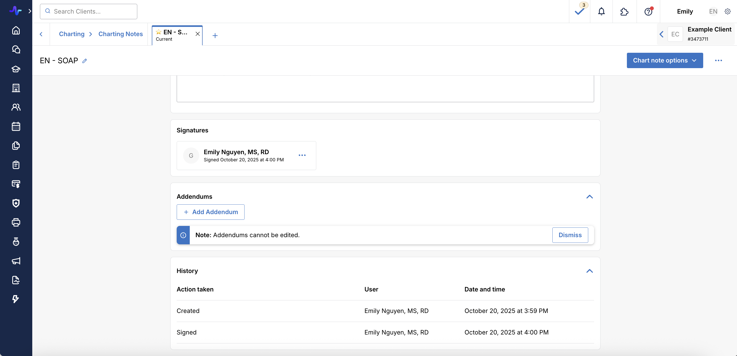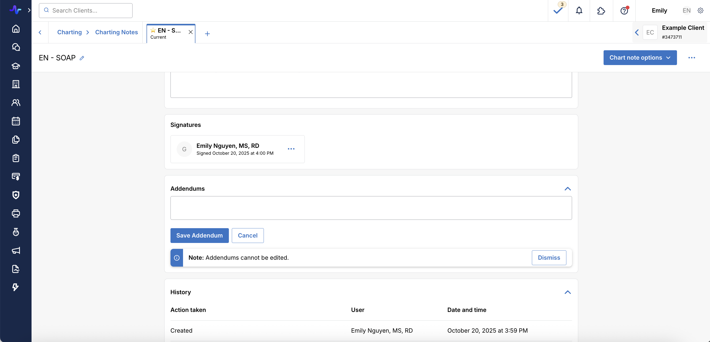 - Addendums remain available after signing and locking. Even after a note is signed and/or locked, providers can still add addendums to document updates or clarifications while preserving the original record.