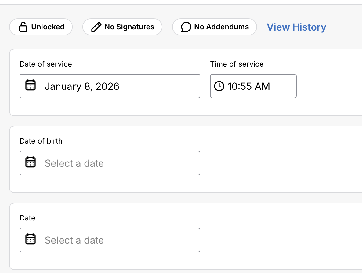 Date fields in charting notes will now appear as an easy-to-use single field with calendar selection. The Date of service and Time of service fields will still appear and auto-populate in the header of each charting note. All other date picker fields (Date of birth, Date) are improved to single fields.