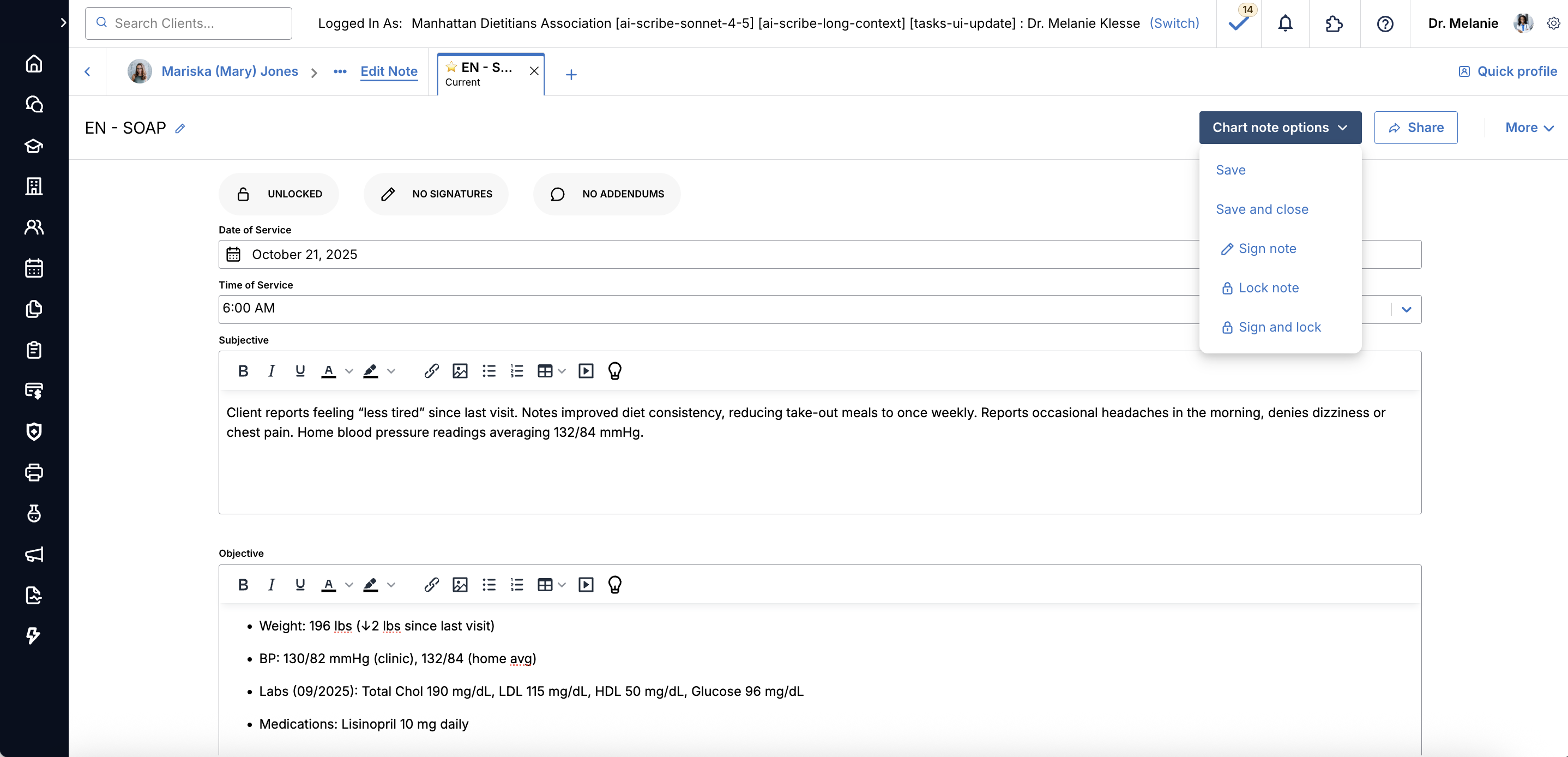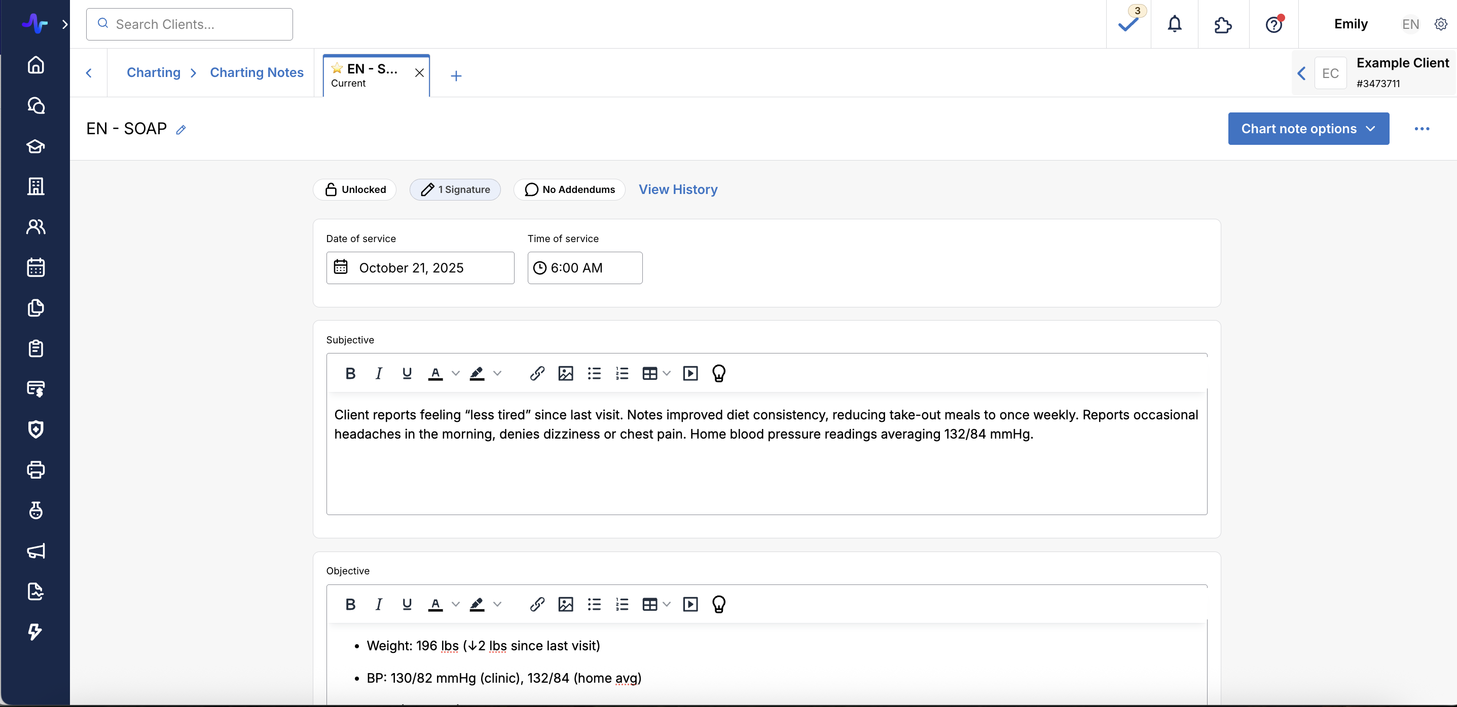 Status indicators at the top of the note clearly show whether a charting note is signed, locked, or has addendums, so providers can quickly understand the note’s state before making changes.
