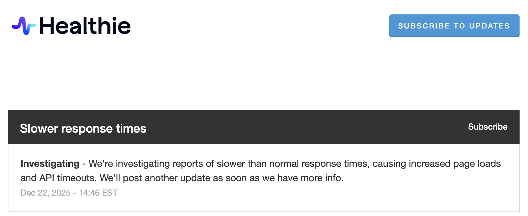 If any part of Healthie feels like it's moving slower than usual, the first thing you should do is check our status page. Our team uses that to report on any issues affecting Healthie, and if there's an active incident you'll be able to see a description of it at the top of the page: