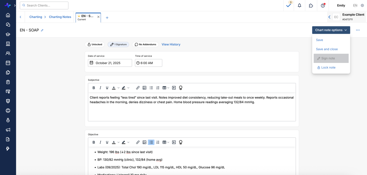 - Co-signer locates the charting note, and clicks Chart Note Options > Sign. They can additionally Lock the note to prevent further edits.