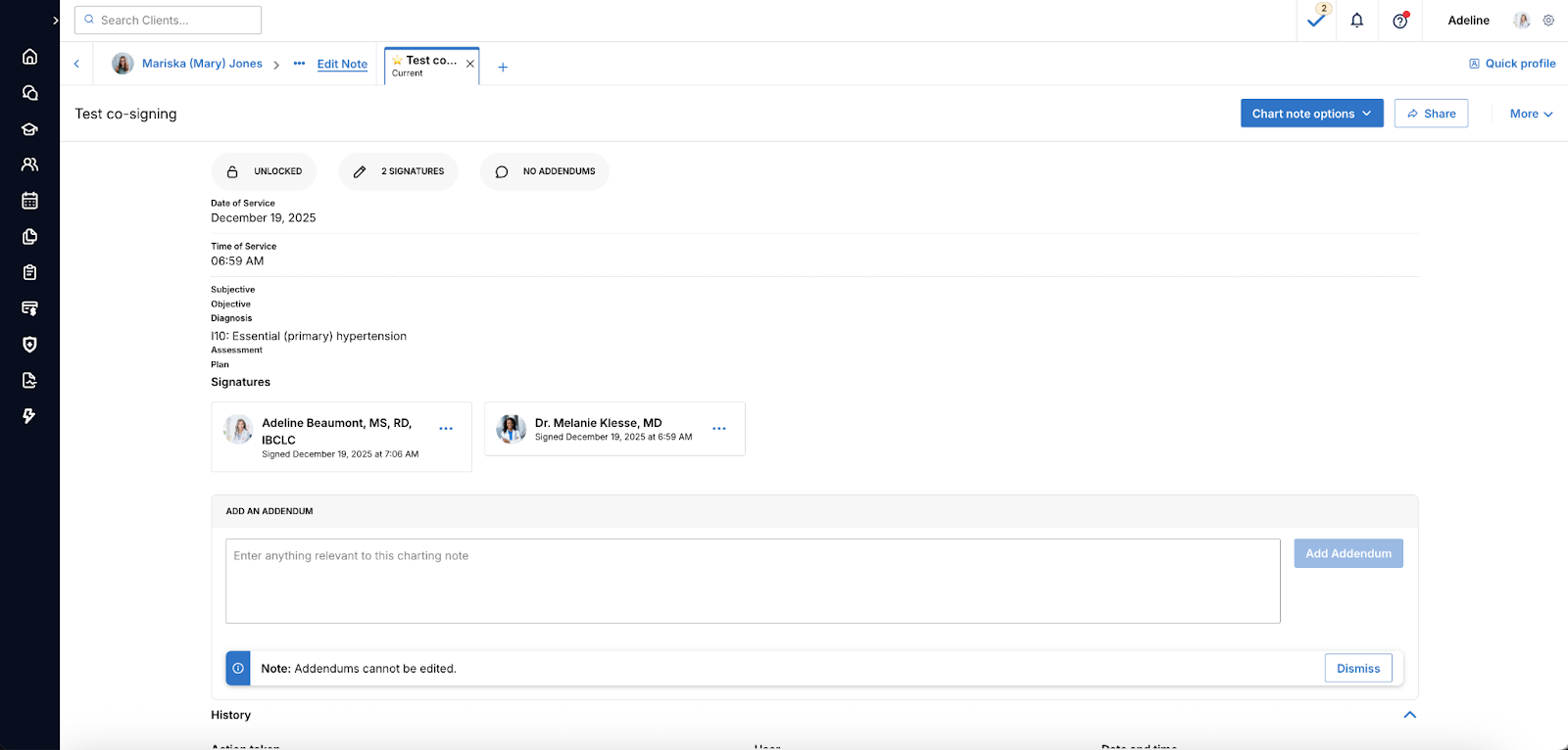 - The charting note will show signatures from the initial and co-signing providers with timestamps.