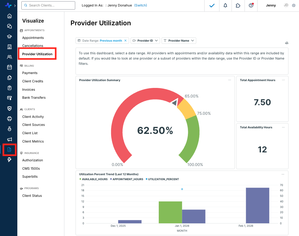 Example: If a provider has 40 hours of availability and 32 hours of appointments scheduled, their utilization percentage would be 80% (32 / 40 × 100).