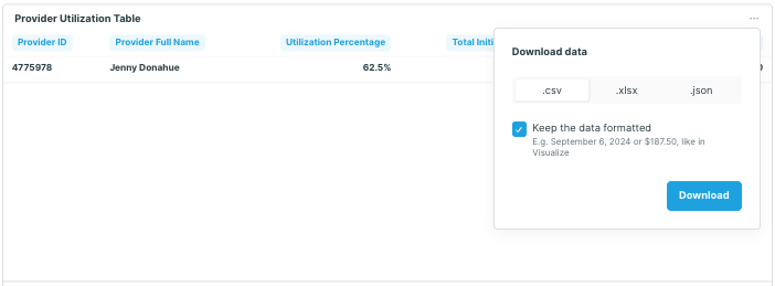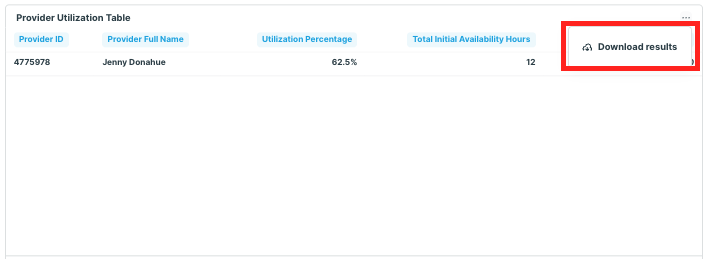 Below the utilization graphs, you'll see the Provider Utilization Table. This is a raw data table with utilization data for the selected date range, and can be downloaded as a CSV, XLSX or JSON file for further analysis. To download the report, click [...] > Download results > select your desired file type > Download. The downloaded file will appear in your devices Downloads folder.