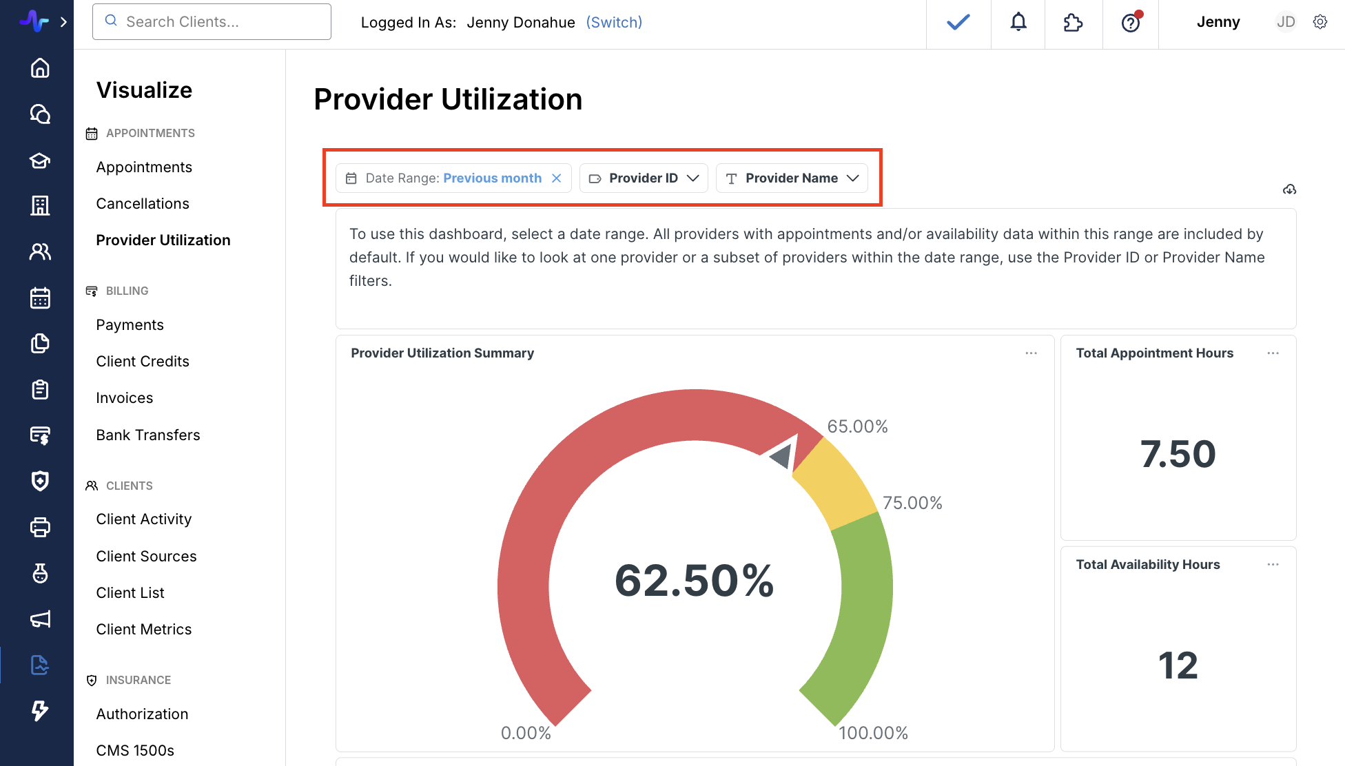 - Provider Selection: filter by individual providers to view specific team members' utilization, or select multiple providers to compare performance across your team.