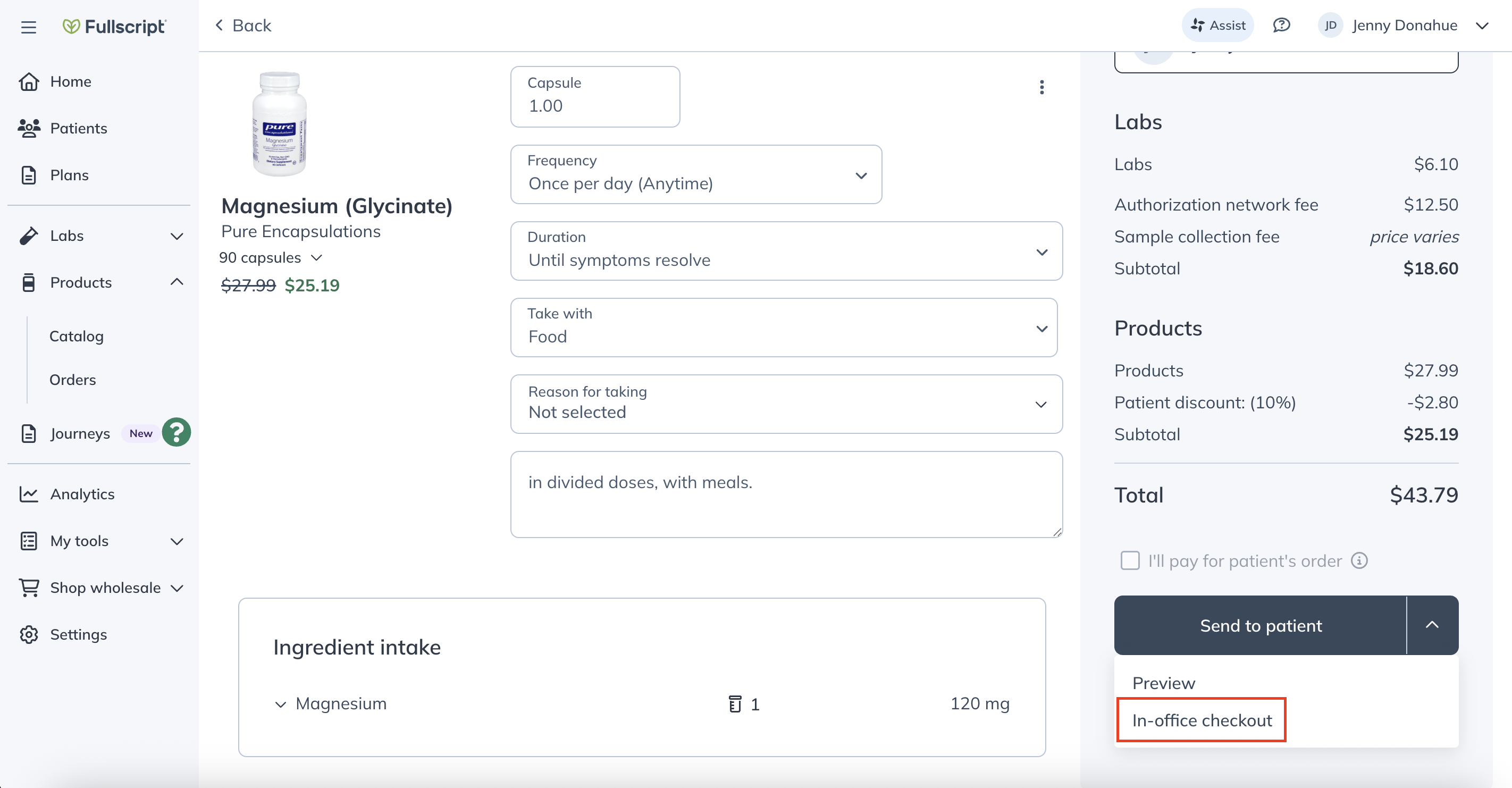 Note: the "I'll pay for my patient's order" option is available for plans that contain lab tests only. If a plan contains supplements, click the down arrow next to Send to patient and select "In-office checkout" to pay for the plan and invoice the client within Healthie.