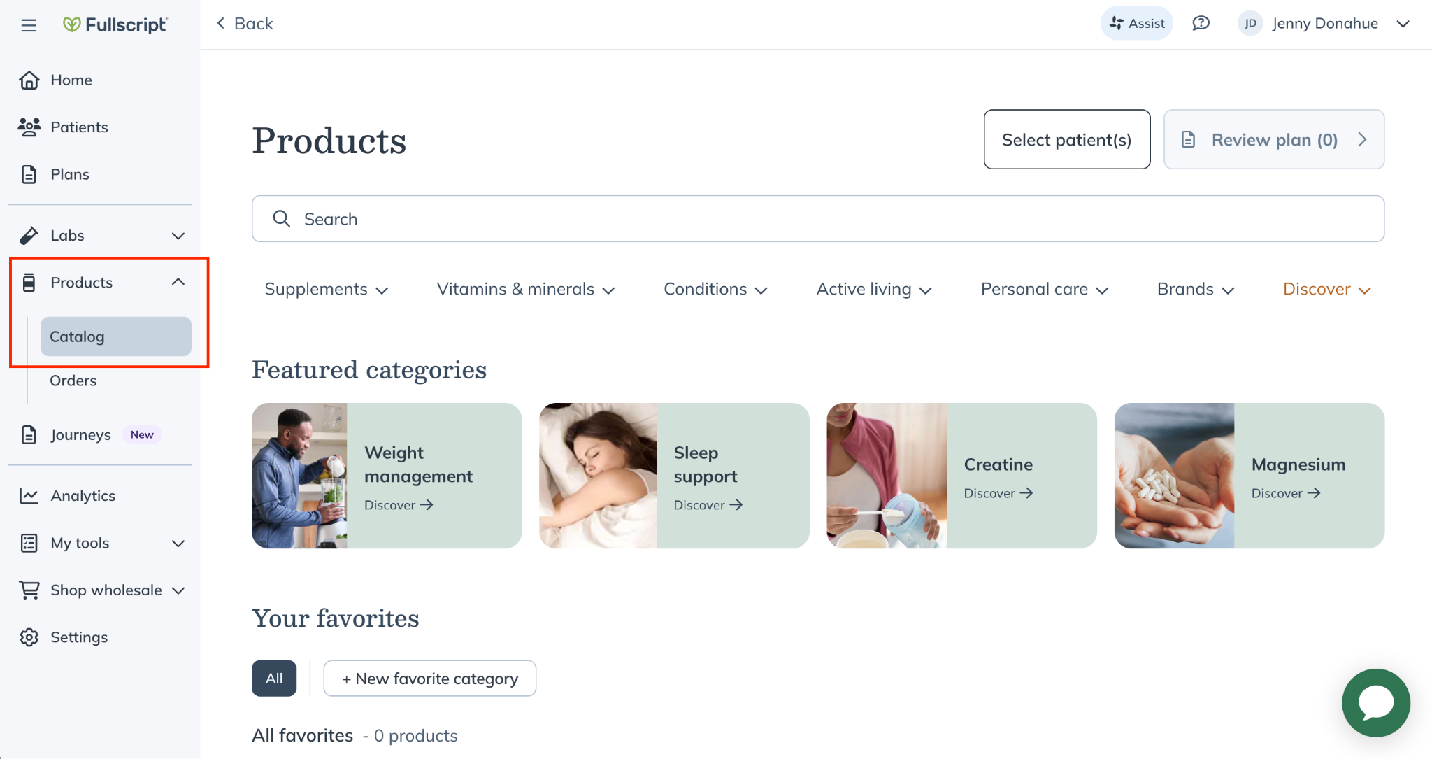 - Within your Fullscript account, you can click on Products > Catalog > locate supplements for your client > click Add to plan for each.