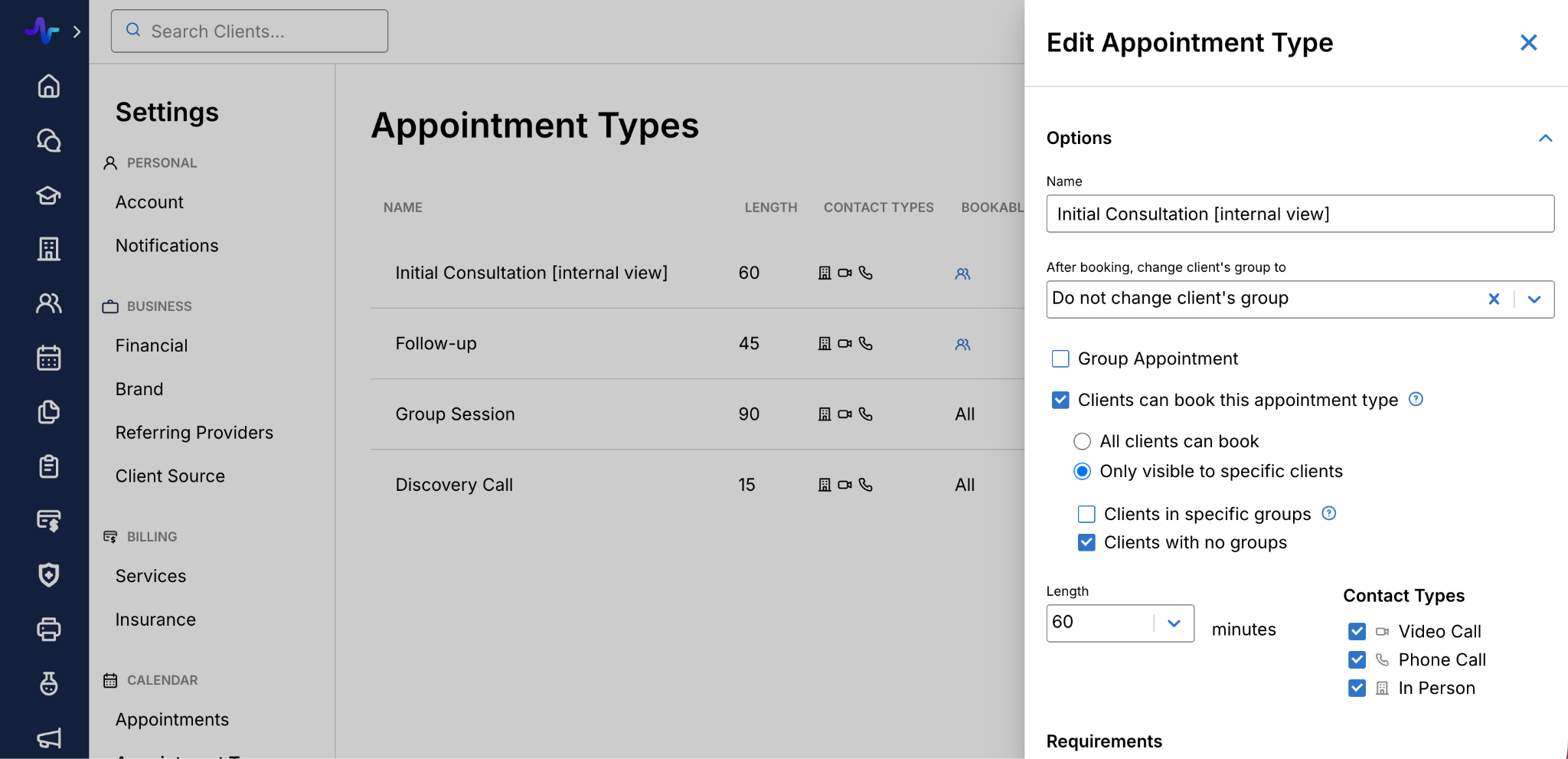 - A side panel drawer will appear > Select or deselect the Clients can book this appointment type option