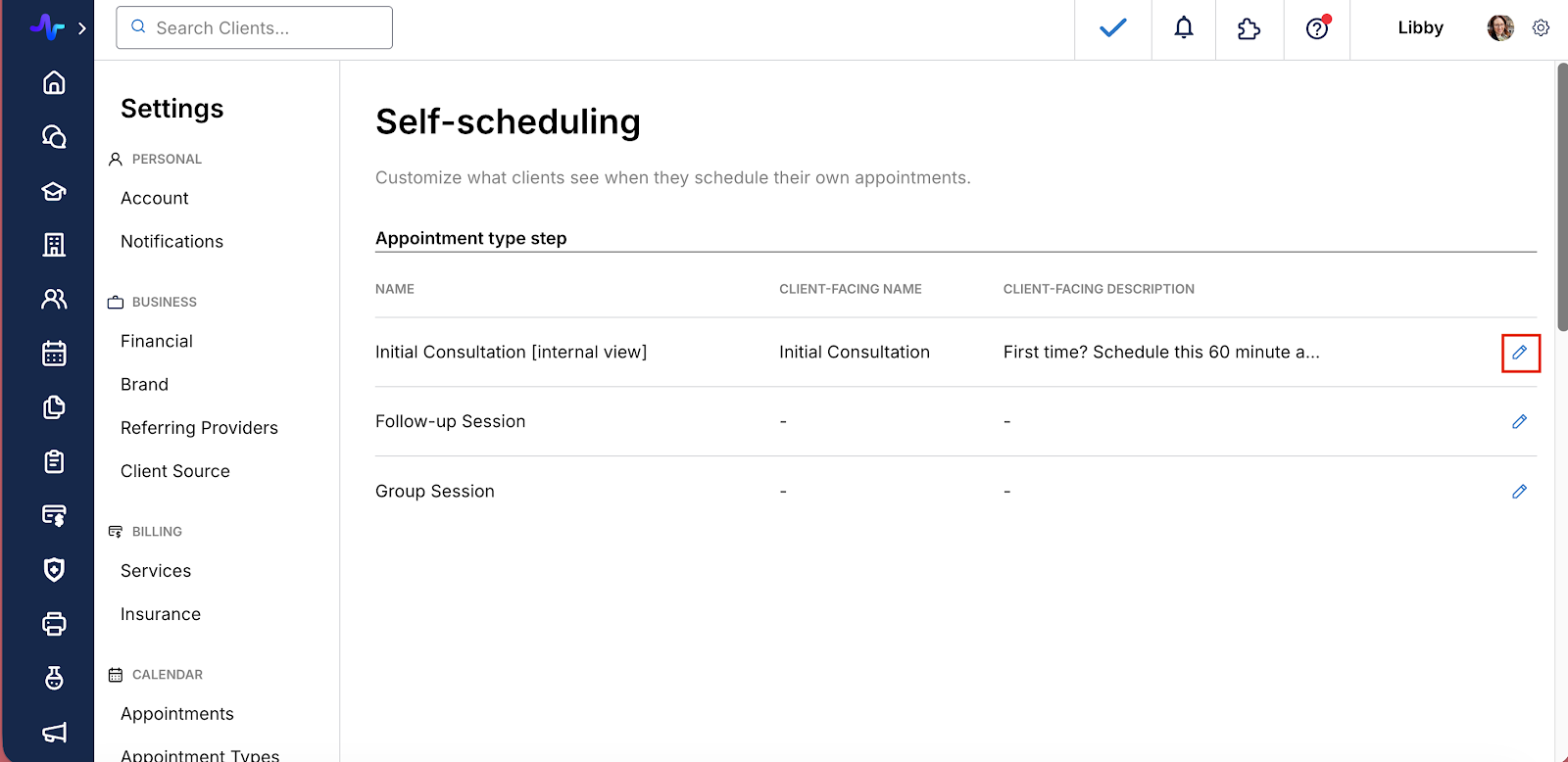 - Click the pencil icon to edit the client-facing name and description of the appointment type.