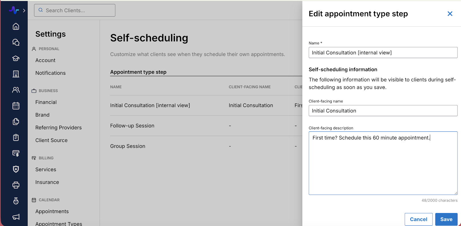 In this edit modal, you are able to create an appointment type name and description that clients will see, that is separate from your internal appointment name. This is helpful when clients are selecting which appointment to book. You can include helpful information, such as how long the appointment is, who should book it, etcetera.