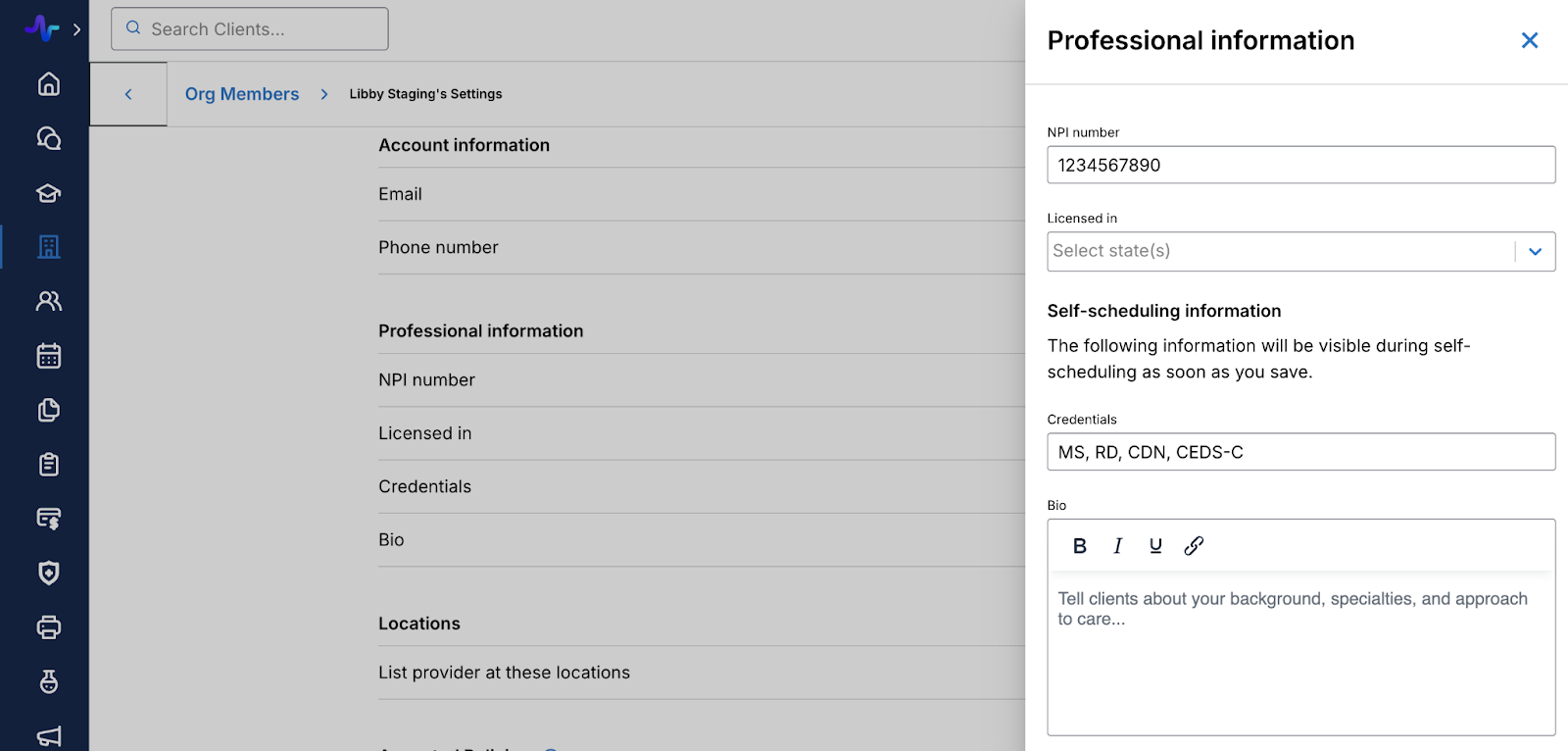 Here you can add the provider’s individual NPI number, states they are licensed in, credentials, and bio.