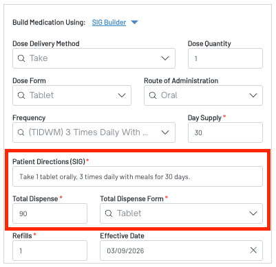 - The Patient Directions (SIG), Total Dispense and Total Dispense Form fields will auto-populate based on the above