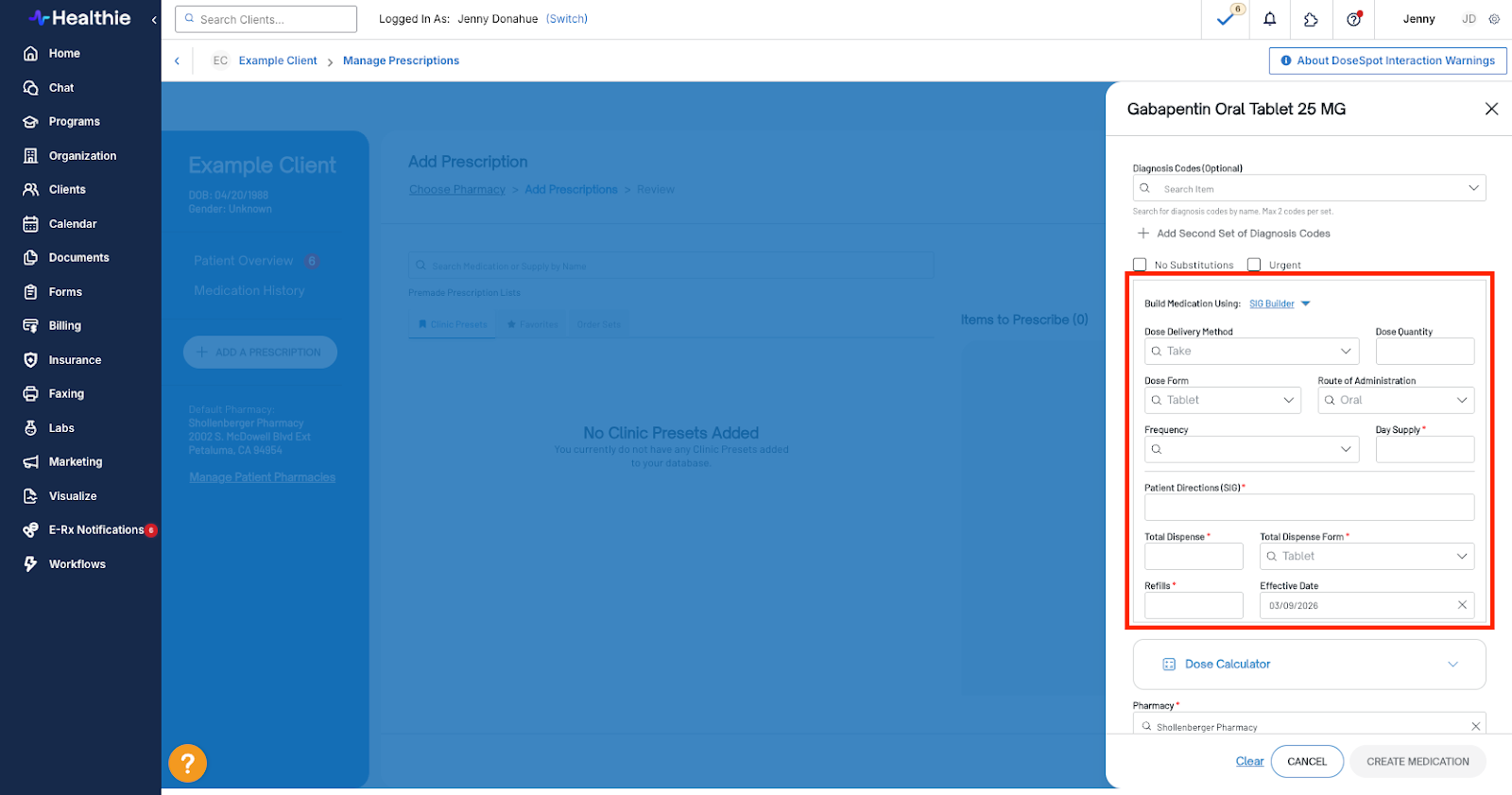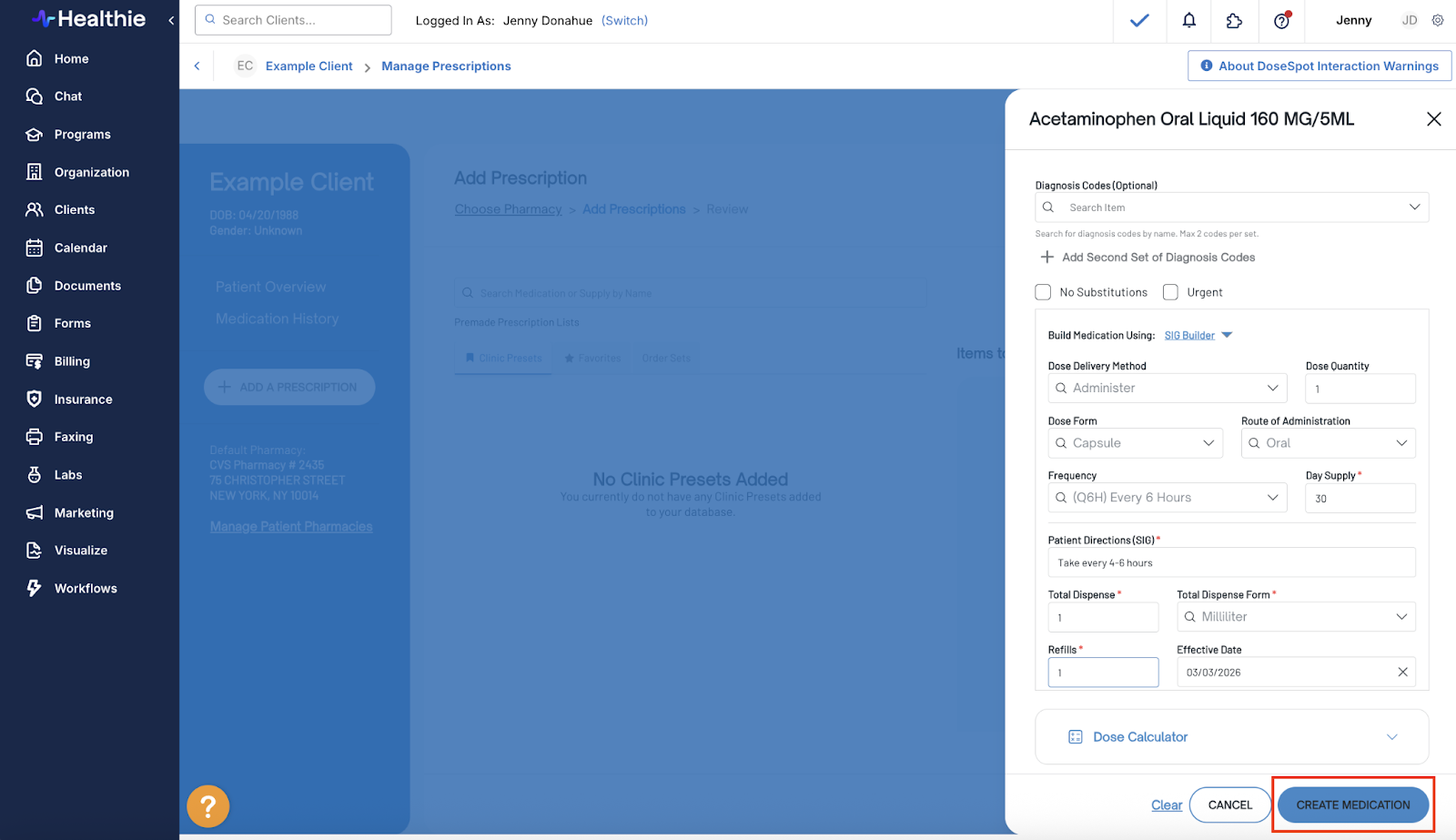 - Click Add Prescription within DoseSpot > complete the medication details > Create Medication