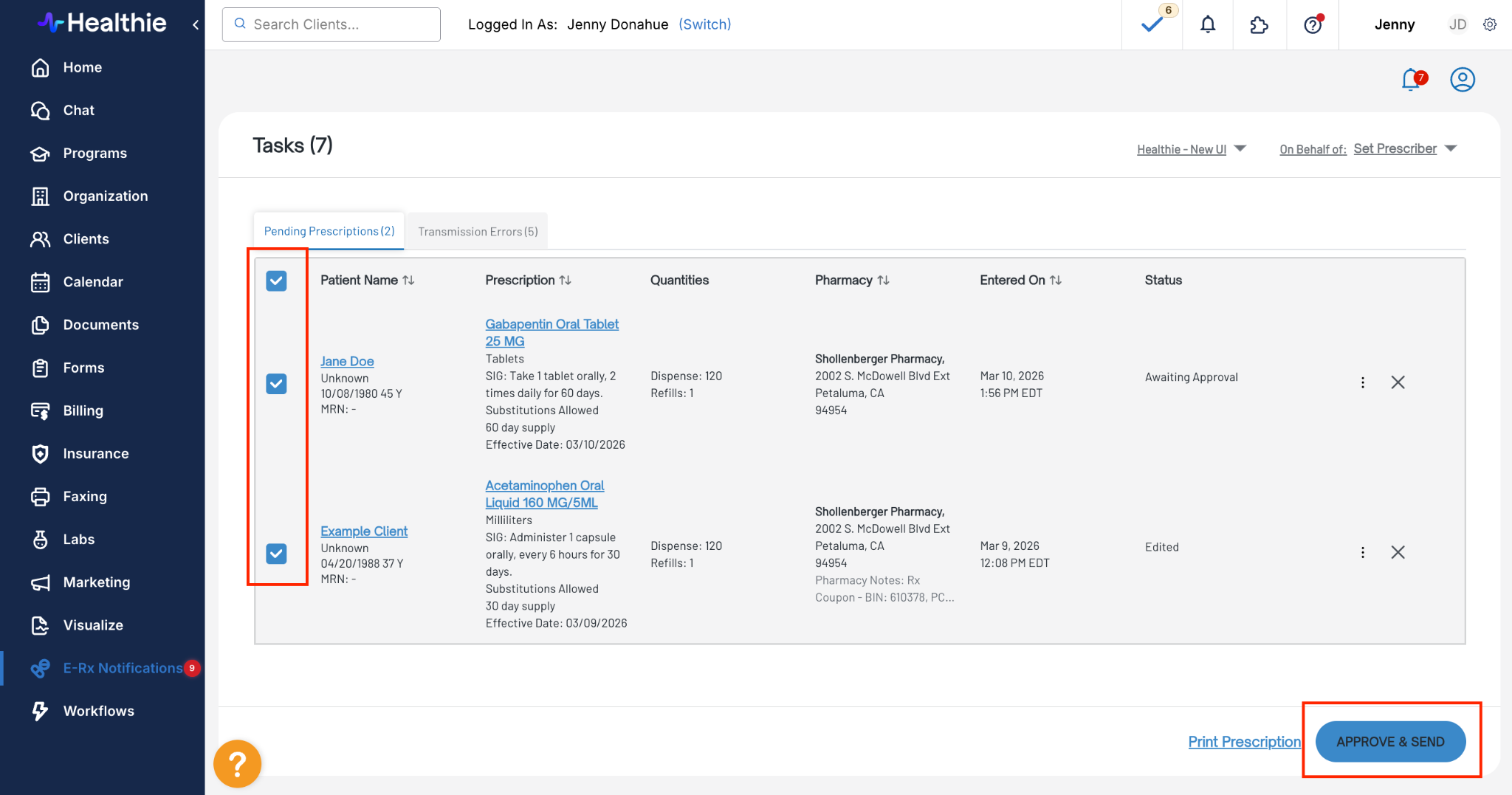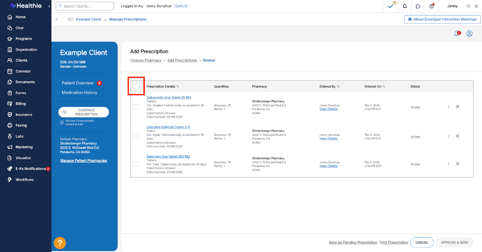 - Select the medications by checking the appropriate boxes > click Approve & Send
