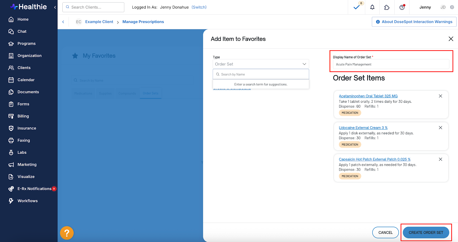Providers can now save commonly prescribed medication combinations as named Order Sets and reuse them for quick ordering across patients.