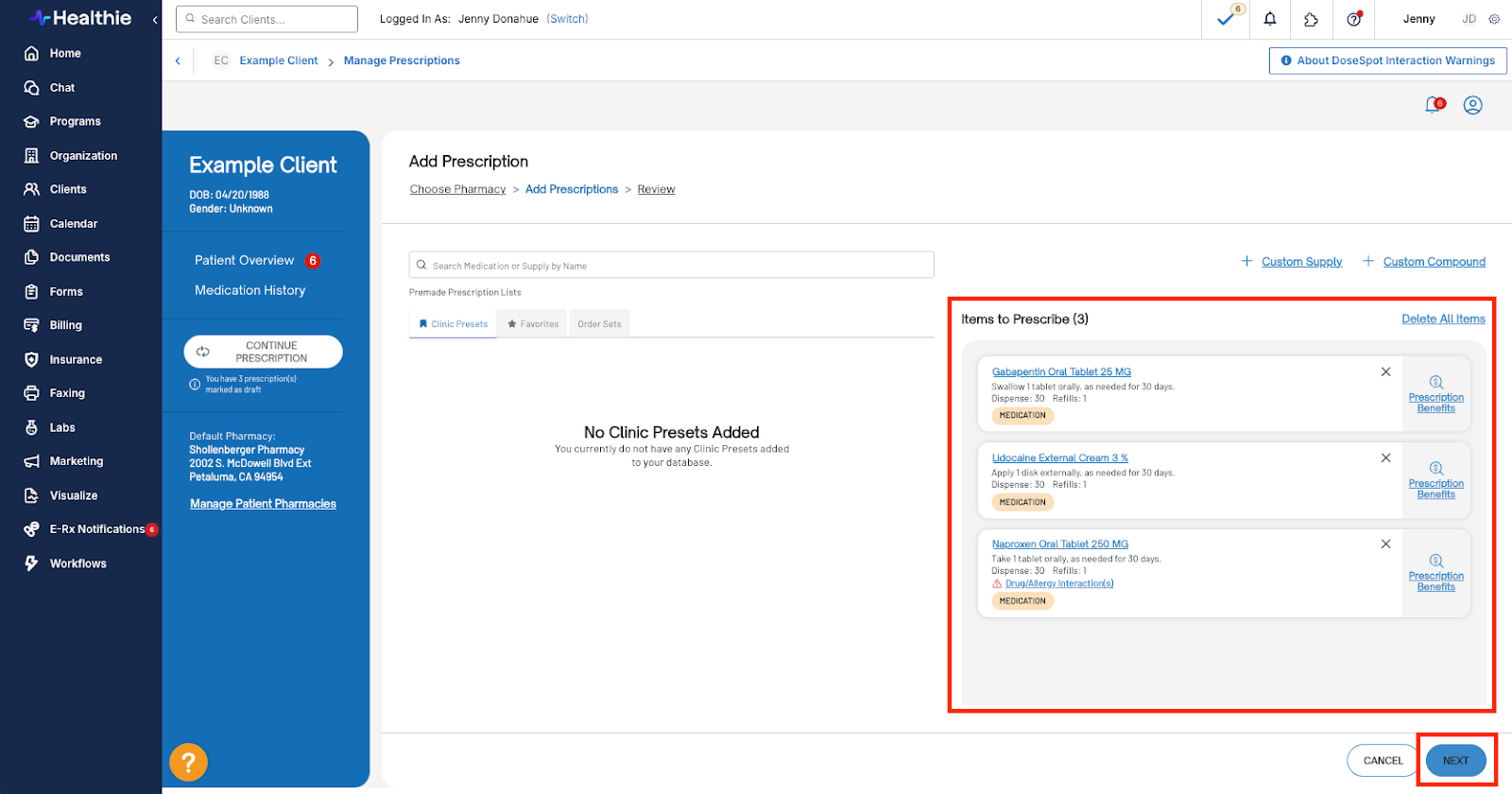 - Once all medications are in the Items to Prescribe section, click Next