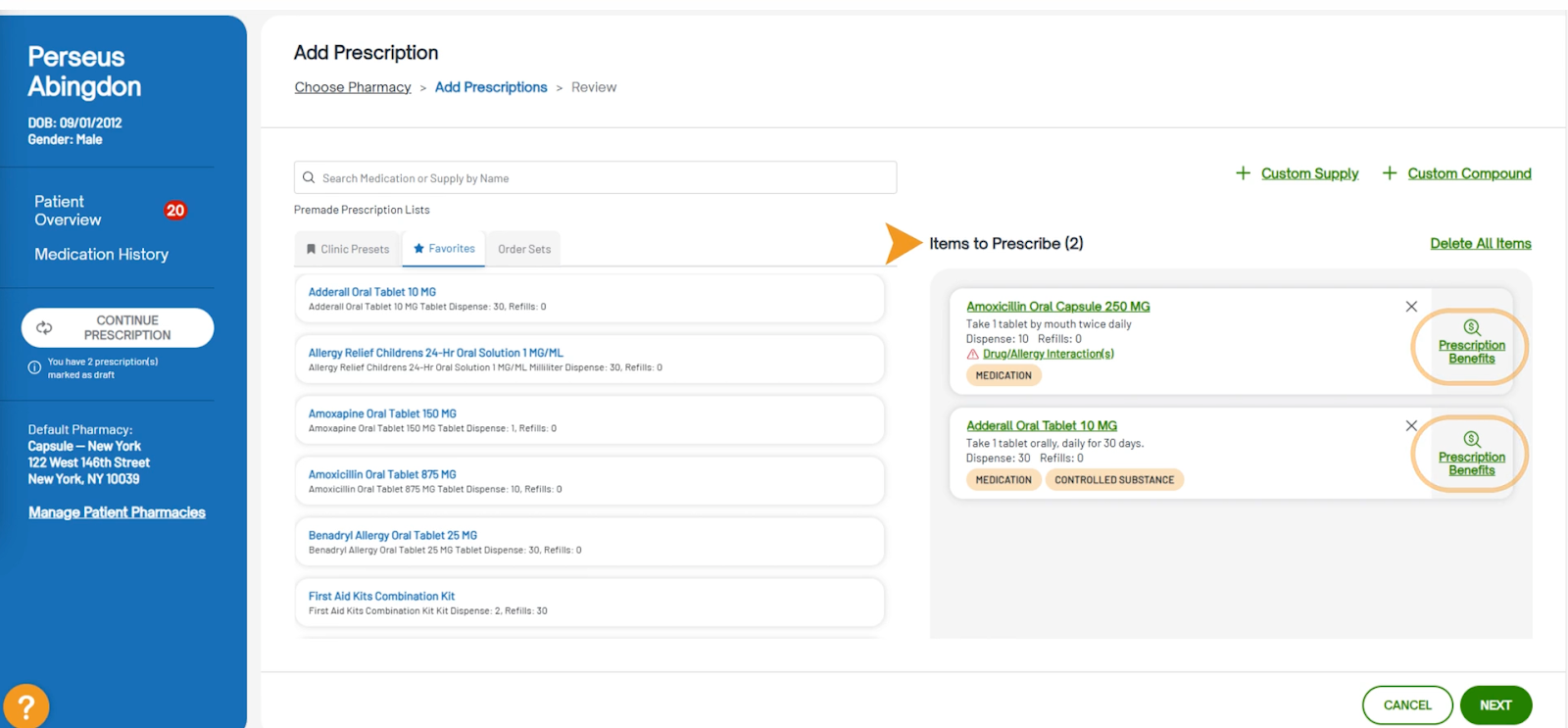 - After adding a medication to the Items to Prescribe section, you can view the benefits for each medication by clicking View Prescription Benefits