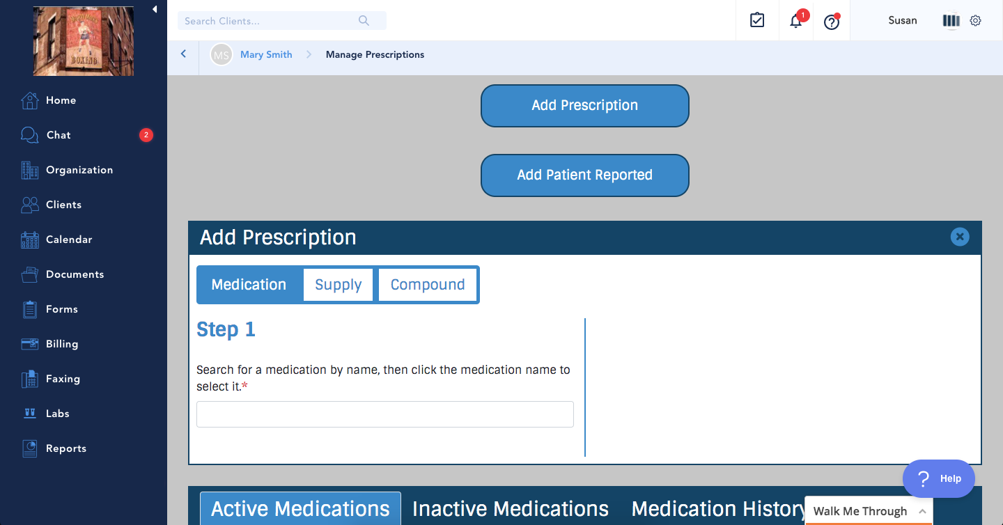 - Click Add Prescription > complete medication details > Create Medication