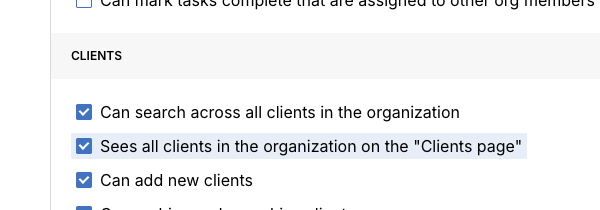 To enable this view for team members, they need the permission Sees all clients in the organization on the "Clients page" which is enabled in the org members settings.