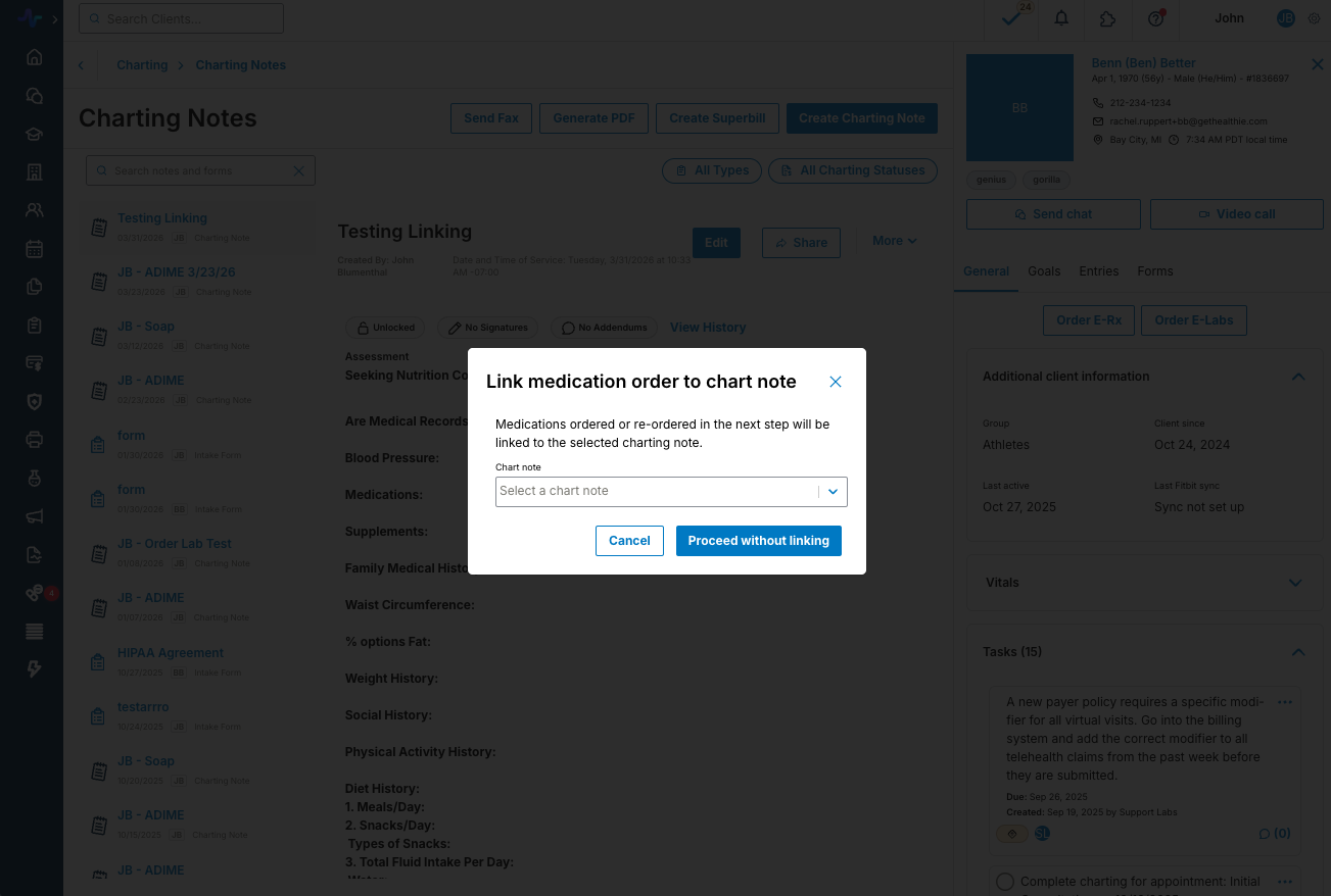 If you do NOT want to link your E-Rx order with a chart note, you can click the "x" in the dropdown to remove the chart note > Proceed without linking.