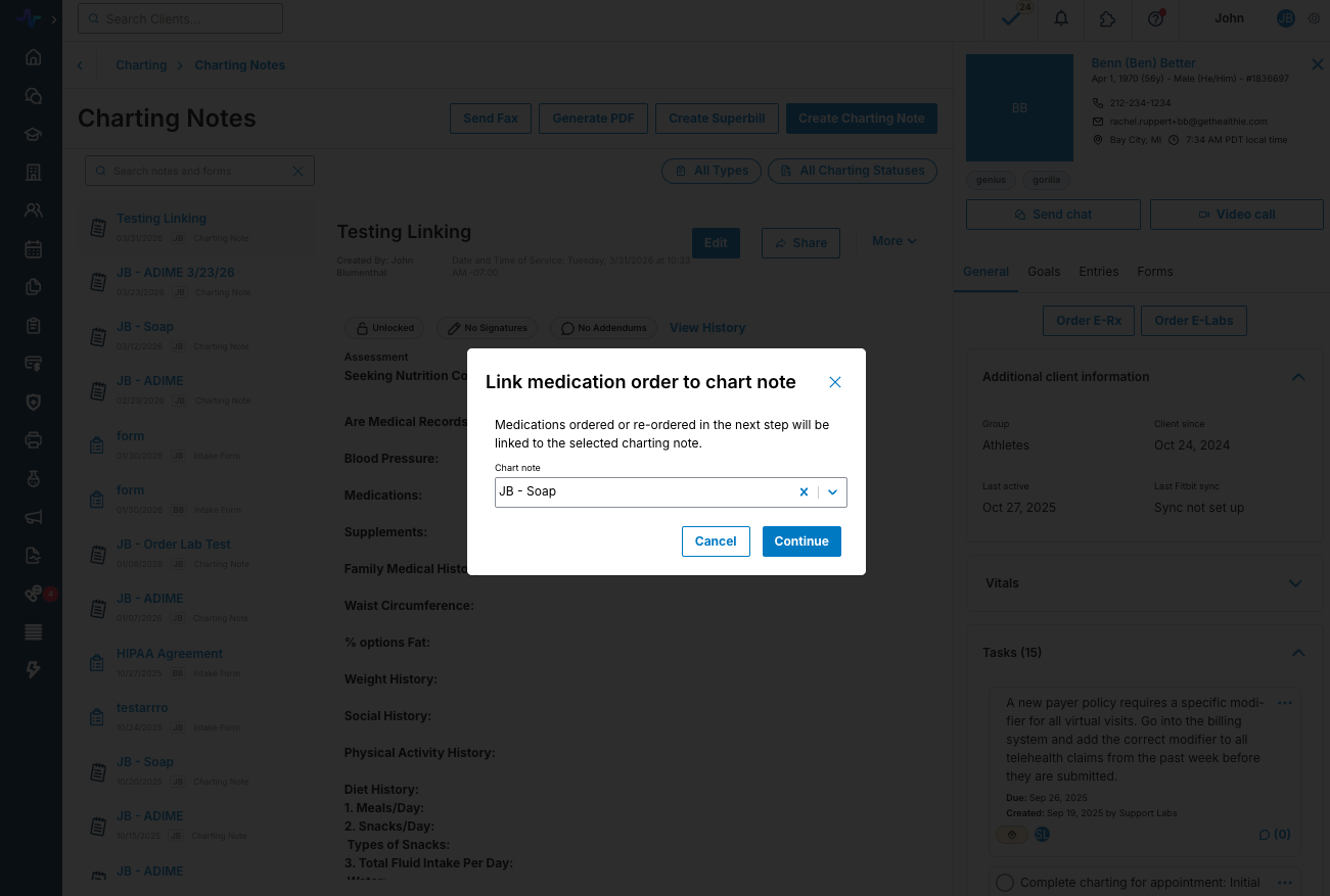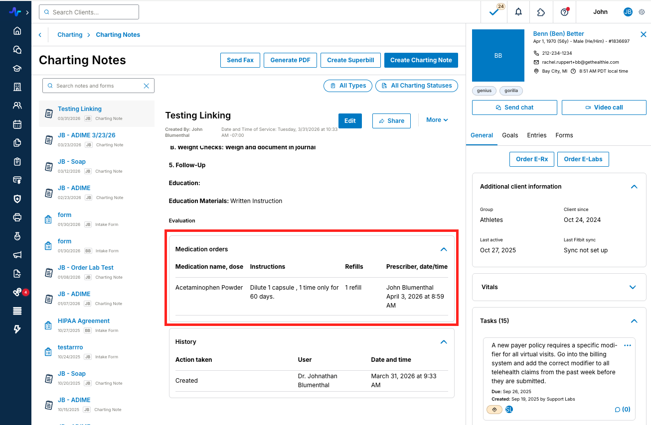 Healthie offers an option to link an E-Rx order to a chart note. If an E-Rx order is linked to a chart note, the details of the order will automatically appear within that chart note. To enable this for your organization, please email hello@gethealthie.com.