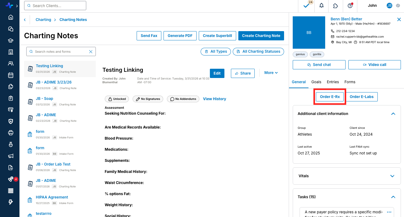 Healthie offers an E-Rx integration with DoseSpot as an add-on to your Healthie plan, which enables clinical providers to prescribe medications electronically from the Healthie platform and the mobile app. Here is an overview of E-Rx and Healthie. E-Rx orders can be placed from the Client Profile Overview and the Quick Profile for easy access to medication-ordering within your workflow.
